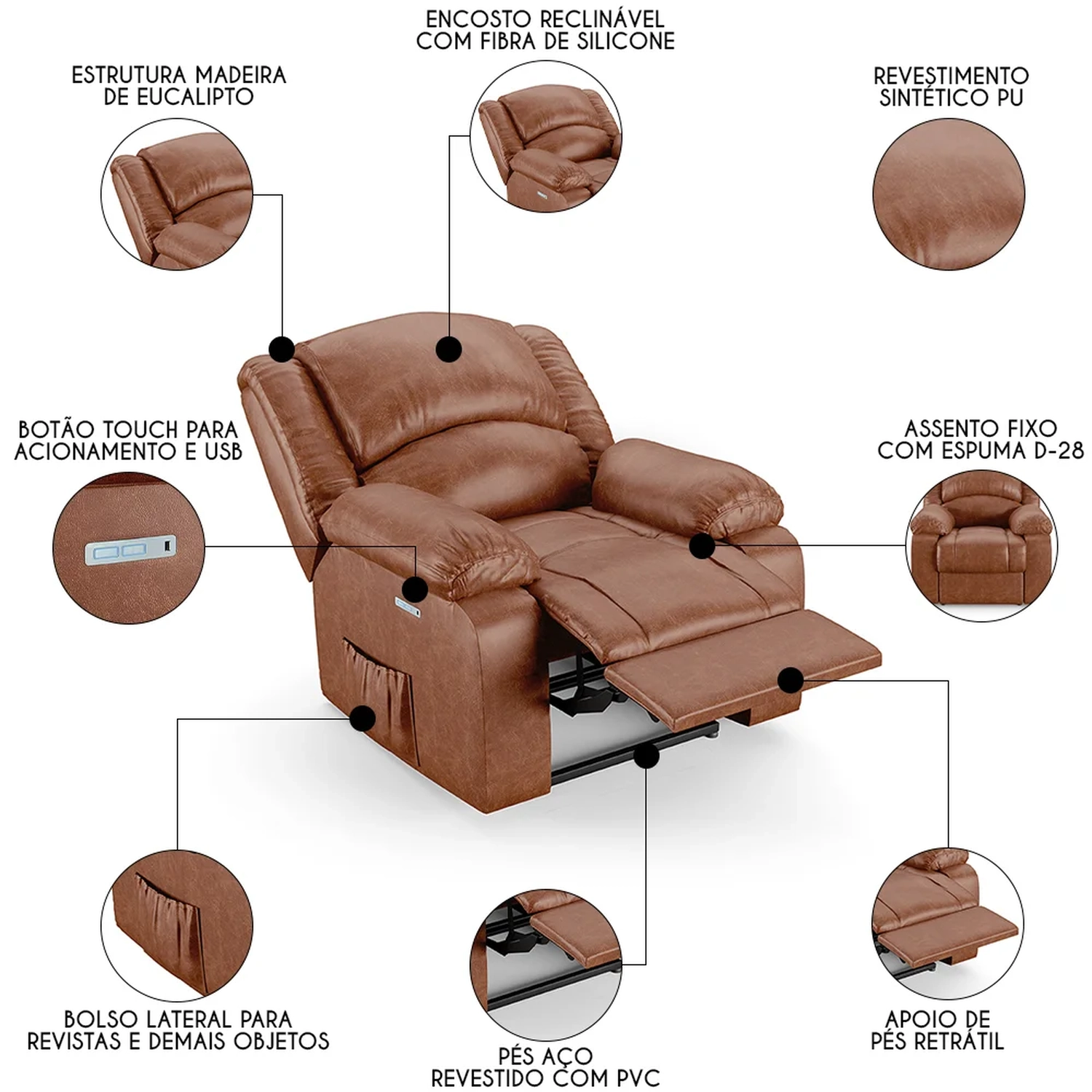 Hora de deixar a sua Sala De Estar mais moderna e transformar em um espaço de entretenimento de última geração com a Poltrona do Papai Reclinável Pietra Elétrica LED FH9 PU Caramelo Brilho, da Mpozenato!