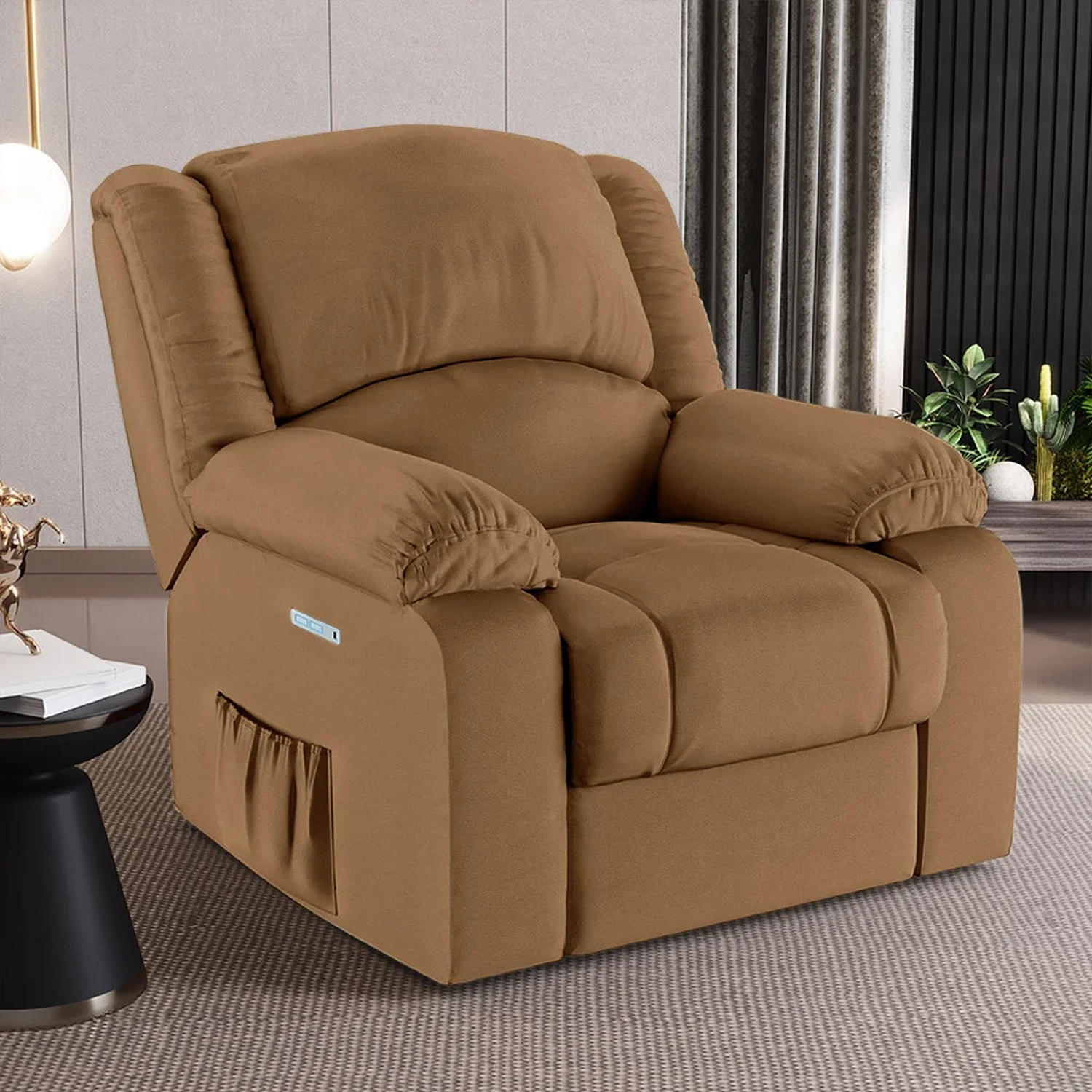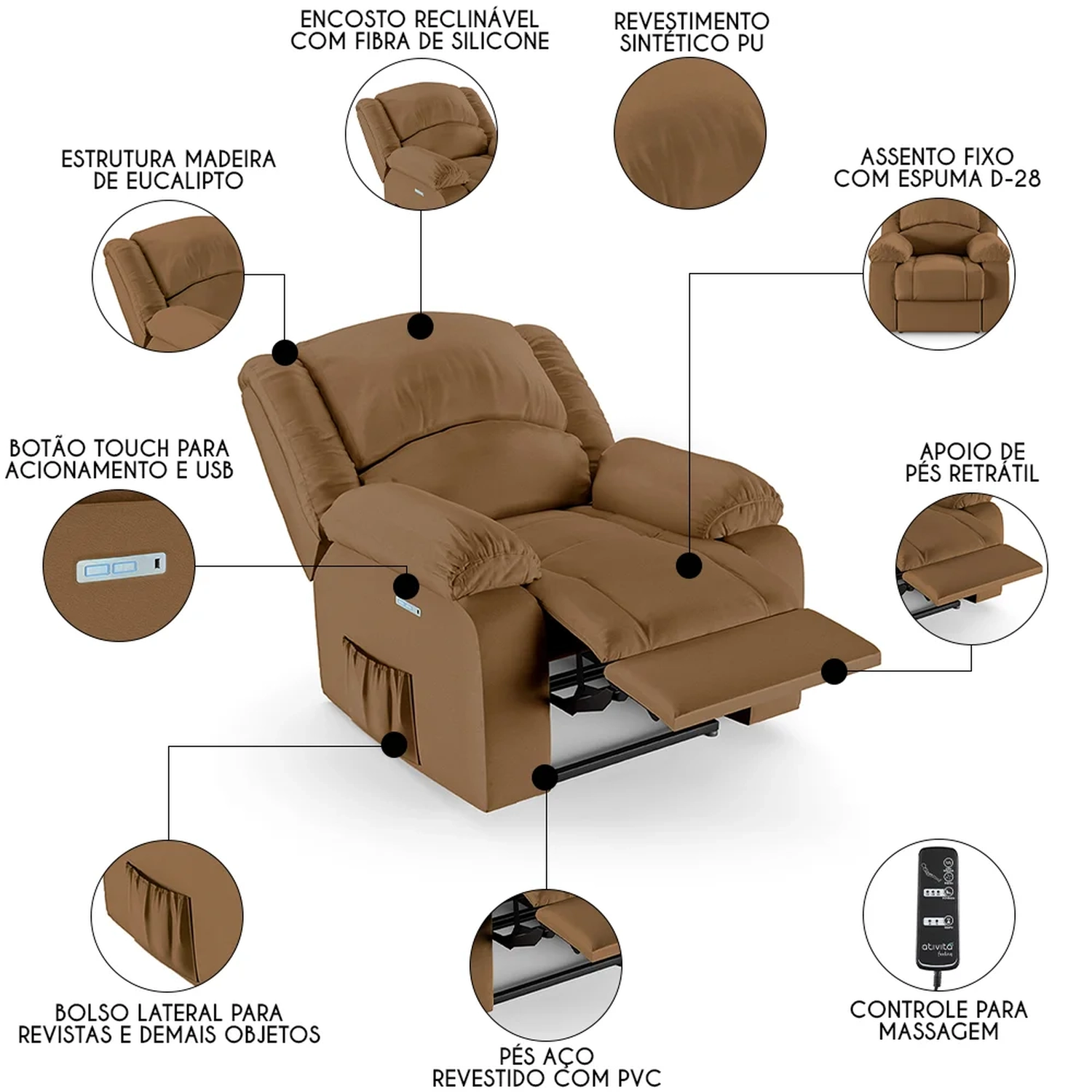 Com um design que alia modernidade e elegância, a Poltrona Reclinável é a escolha perfeita para aqueles que não abrem mão do conforto supremo. Seja mergulhando nas páginas de uma revista, um bom livro que pode ficar no bolso lateral ou se deliciando com seus filmes e séries prediletos, esta Poltrona Do Papai promete ser o seu refúgio particular. A adição do Botão elétrico com LED para massagem eleva o nível de relaxamento, proporcionando uma experiência de cinema com o benefício terapêutico de uma massagem. Ah! E ela ainda conta com entrada USB e tipo C ideal para carregar seus eletrônicos enquanto descansa, tudo pensado para proporcionar uma experiência imersiva sem igual. E não é só sobre conforto, mas também sobre durabilidade e estilo, como a madeira maciça de eucalipto e o revestimento de alta qualidade. As dimensões generosas garantem que você tenha espaço de sobra para relaxar, enquanto a capacidade de suportar até 130kg assegura que é uma peça robusta e confiável. Não é apenas uma Poltrona Massageadora, é um upgrade na sua qualidade de vida, trazendo o glamour do cinema diretamente para o seu lar.