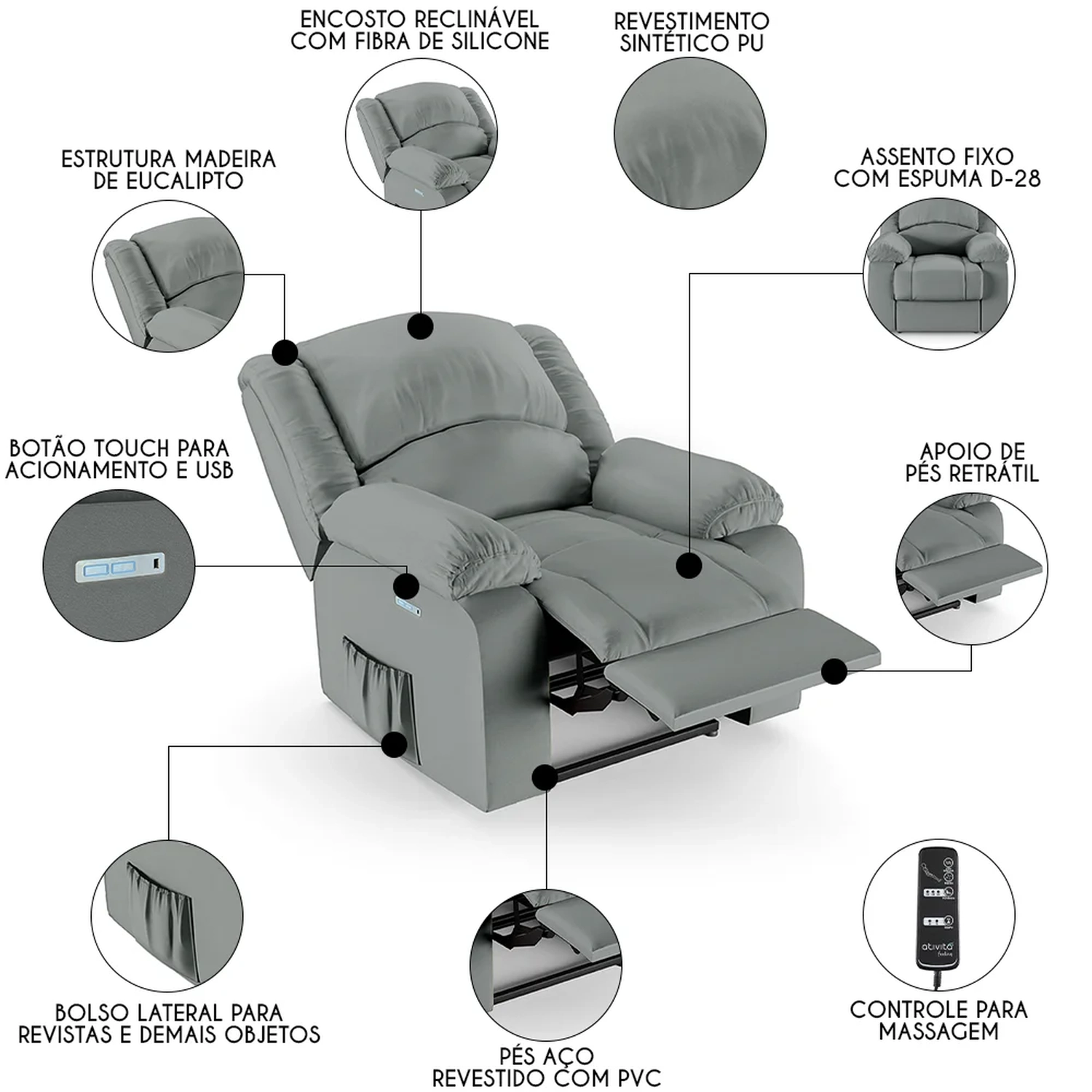 Mecanismo: Botão elétrico com LED, massagem e entrada USB.