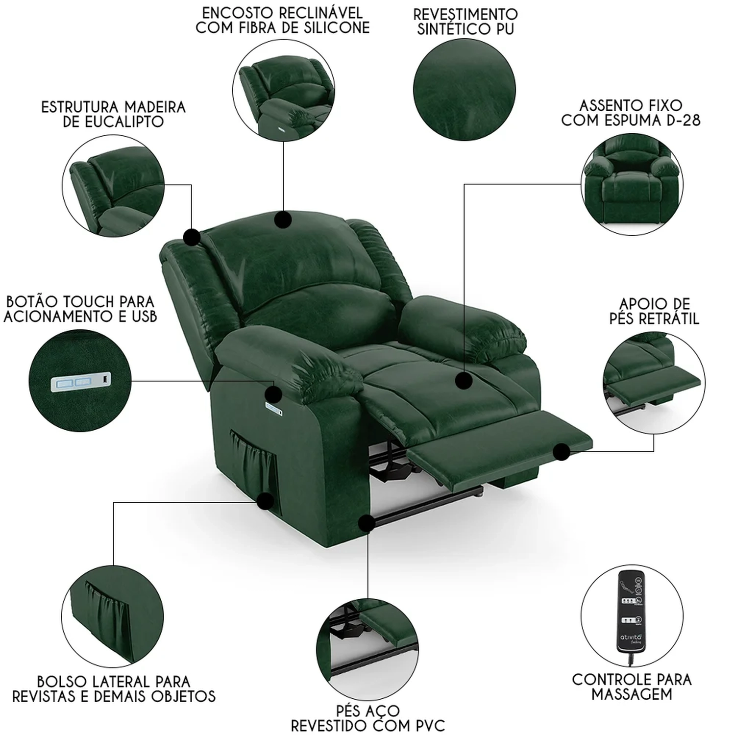 Mecanismo: Botão elétrico com LED, massagem e entrada USB.