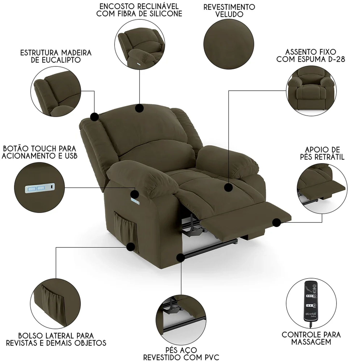 A Poltrona do Papai Reclinável Pietra Elétrica LED Massagem FH9 Veludo Capuccino, da Mpozenato é deal para transformar a sua Sala De Estar em um espaço confortável de entretenimento de última geração!