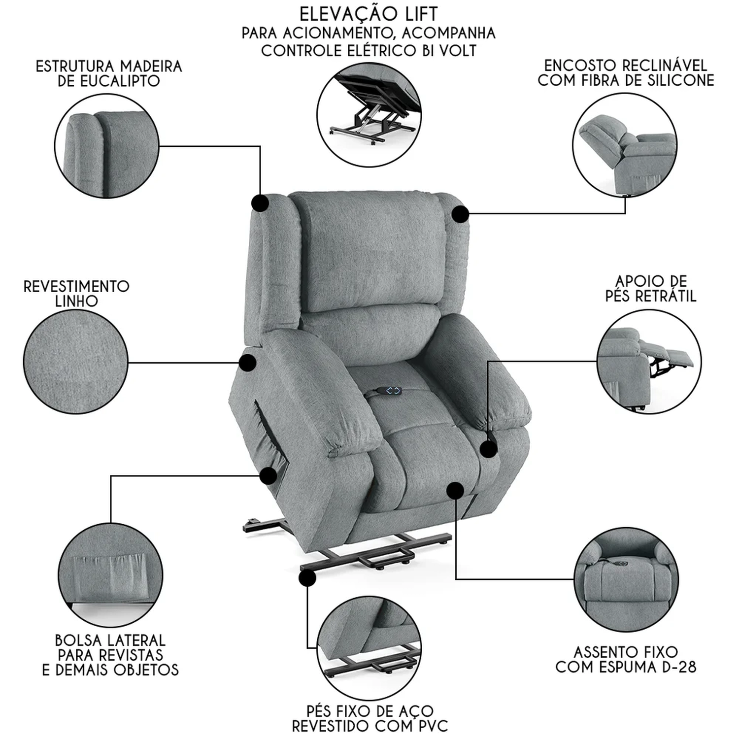 Com seu revestimento de qualidade, ela não só oferece uma superfície fácil de limpar, mas também um toque de sofisticação ao ambiente. Produzida com estrutura em eucalipto, assento em espuma D28 e molas, encosto em fibra de silicone são materiais que garantem mais qualidade e durabilidade a peça. O mecanismo LIFT é um exemplo de inovação, permitindo um ajuste suave da inclinação e elevação da poltrona, tornando-a ideal para aqueles que buscam alívio e suporte após um longo dia. Seja mergulhando nas páginas de uma revista, um bom livro que pode ficar no bolso lateral ou se deliciando com seus filmes e séries prediletos. A Poltrona Pós Operatório traz funcionalidade de elevação benéfica para evitar a força nos joelhos na hora de se levantar, para pessoas que enfrentam desafios de mobilidade, idosos ou gestantes, facilitando o movimento de sentar e levantar sem esforço adicional. A característica bivolt da Poltrona Do Papai com controle assegura que ela possa ser utilizada em diversos ambientes, adaptando-se a diferentes necessidades elétricas sem a preocupação de incompatibilidade de tensão. O apoio para os pés, que se eleva em conjunto com o encosto, é projetado para promover uma postura ergonômica, aliviando a tensão nas pernas e na lombar, enquanto os braços largos oferecem um suporte adicional e um conforto extra durante o uso.