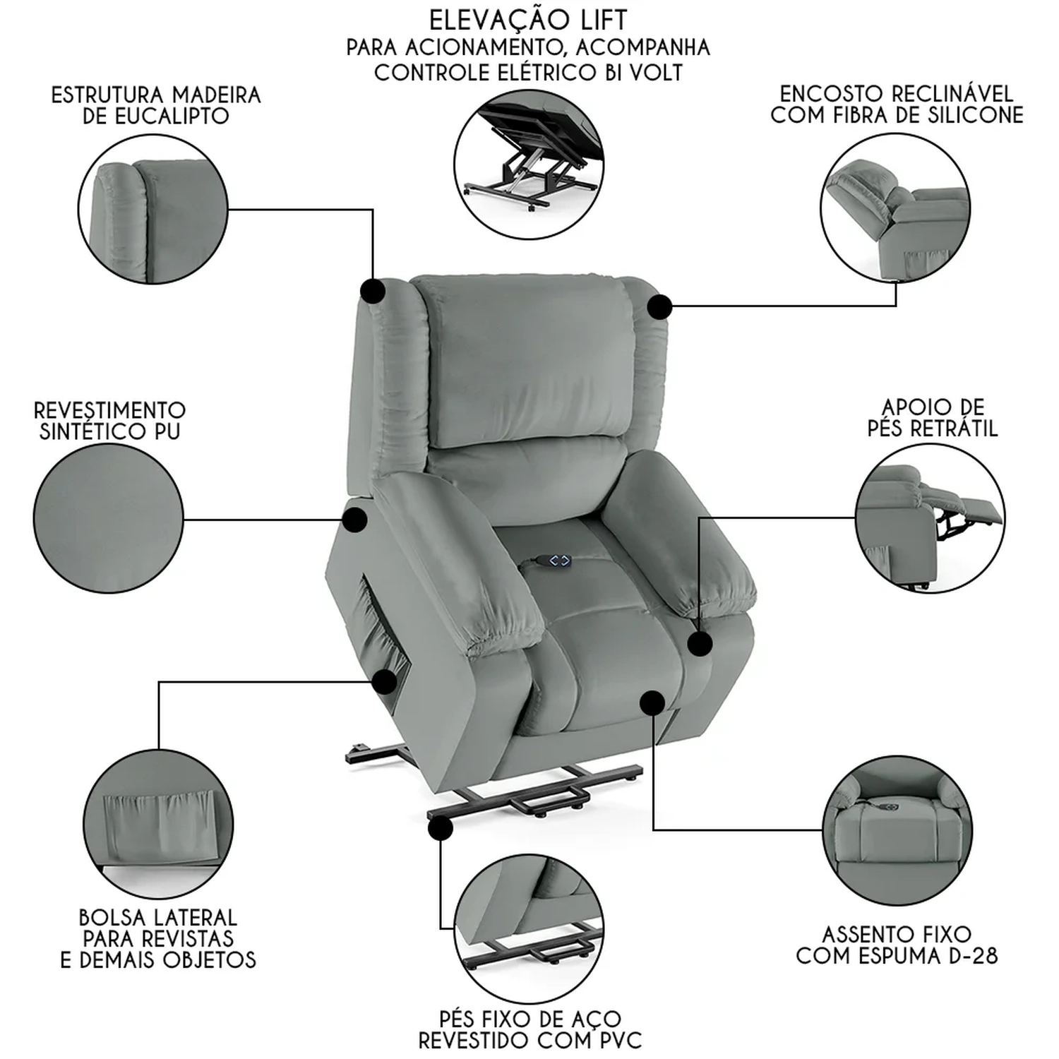 Com seu revestimento de qualidade, ela não só oferece uma superfície fácil de limpar, mas também um toque de sofisticação ao ambiente. Produzida com estrutura em eucalipto, assento em espuma D28 e molas, encosto em fibra de silicone são materiais que garantem mais qualidade e durabilidade a peça. O mecanismo LIFT é um exemplo de inovação, permitindo um ajuste suave da inclinação e elevação da poltrona, tornando-a ideal para aqueles que buscam alívio e suporte após um longo dia. Seja mergulhando nas páginas de uma revista, um bom livro que pode ficar no bolso lateral ou se deliciando com seus filmes e séries prediletos. A Poltrona Pós Operatório traz funcionalidade de elevação benéfica para evitar a força nos joelhos na hora de se levantar, para pessoas que enfrentam desafios de mobilidade, idosos ou gestantes, facilitando o movimento de sentar e levantar sem esforço adicional. A característica bivolt da Poltrona Do Papai com controle assegura que ela possa ser utilizada em diversos ambientes, adaptando-se a diferentes necessidades elétricas sem a preocupação de incompatibilidade de tensão. O apoio para os pés, que se eleva em conjunto com o encosto, é projetado para promover uma postura ergonômica, aliviando a tensão nas pernas e na lombar, enquanto os braços largos oferecem um suporte adicional e um conforto extra durante o uso.