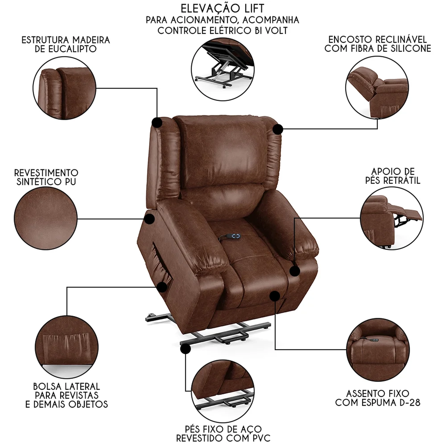 A Poltrona do Papai Reclinável Pietra Elevação Lift Elétrico FH9 PU Marrom Brilho, da Mpozenato é uma peça de mobiliário que redefine o conforto e a acessibilidade na sua Sala De Estar.