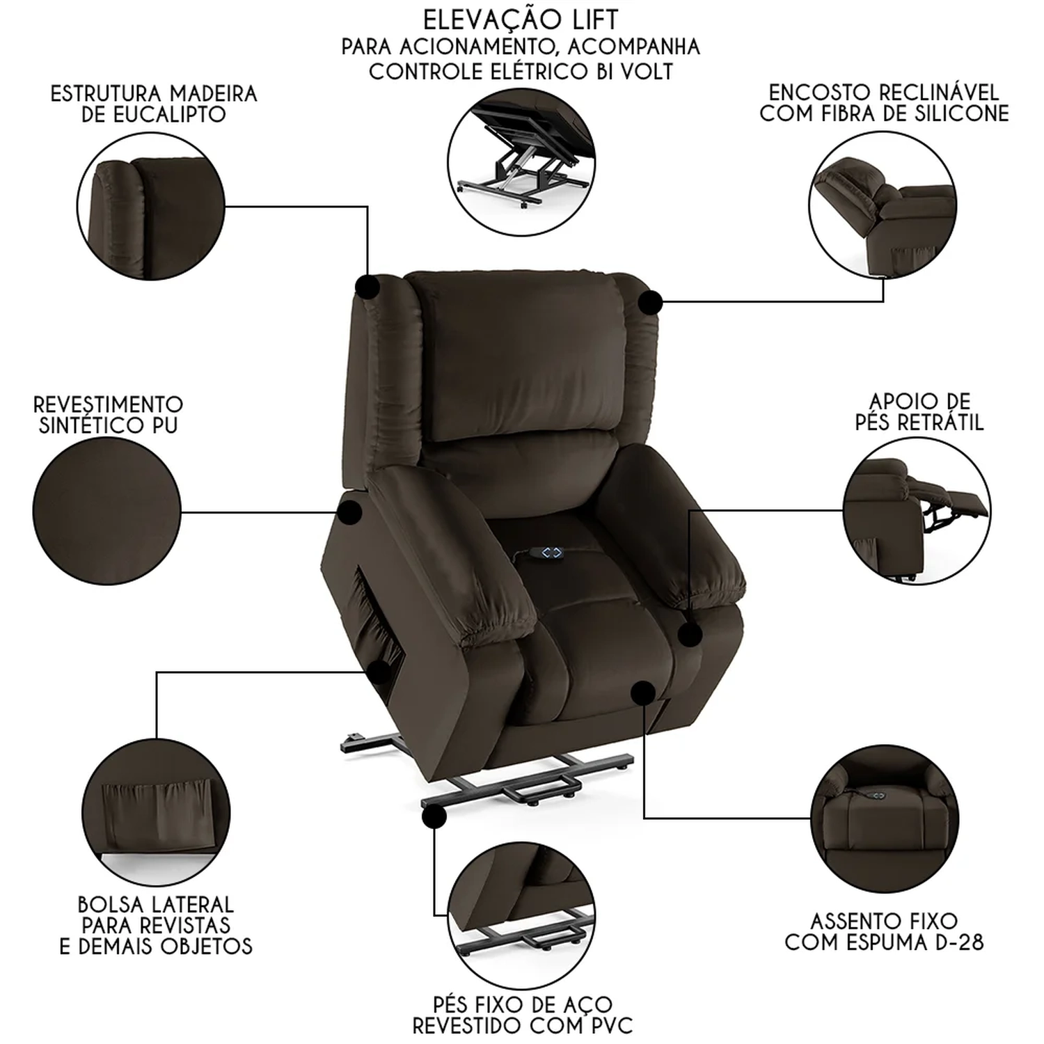 Com seu revestimento de qualidade, ela não só oferece uma superfície fácil de limpar, mas também um toque de sofisticação ao ambiente. Produzida com estrutura em eucalipto, assento em espuma D28 e molas, encosto em fibra de silicone são materiais que garantem mais qualidade e durabilidade a peça. O mecanismo LIFT é um exemplo de inovação, permitindo um ajuste suave da inclinação e elevação da poltrona, tornando-a ideal para aqueles que buscam alívio e suporte após um longo dia. Seja mergulhando nas páginas de uma revista, um bom livro que pode ficar no bolso lateral ou se deliciando com seus filmes e séries prediletos. A Poltrona Pós Operatório traz funcionalidade de elevação benéfica para evitar a força nos joelhos na hora de se levantar, para pessoas que enfrentam desafios de mobilidade, idosos ou gestantes, facilitando o movimento de sentar e levantar sem esforço adicional. A característica bivolt da Poltrona Do Papai com controle assegura que ela possa ser utilizada em diversos ambientes, adaptando-se a diferentes necessidades elétricas sem a preocupação de incompatibilidade de tensão. O apoio para os pés, que se eleva em conjunto com o encosto, é projetado para promover uma postura ergonômica, aliviando a tensão nas pernas e na lombar, enquanto os braços largos oferecem um suporte adicional e um conforto extra durante o uso.
