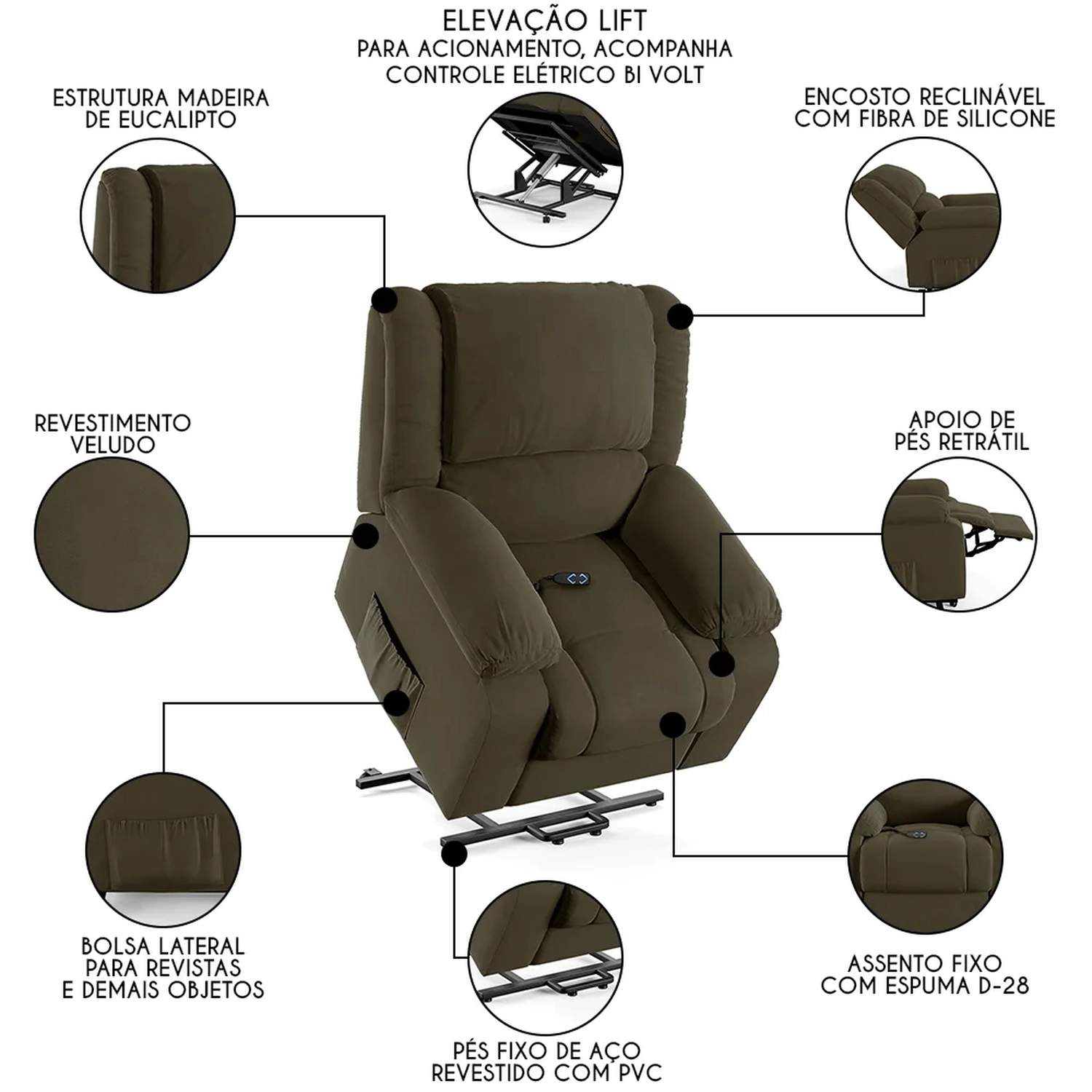 Com seu revestimento de qualidade, ela não só oferece uma superfície fácil de limpar, mas também um toque de sofisticação ao ambiente. Produzida com estrutura em eucalipto, assento em espuma D28 e molas, encosto em fibra de silicone são materiais que garantem mais qualidade e durabilidade a peça. O mecanismo LIFT é um exemplo de inovação, permitindo um ajuste suave da inclinação e elevação da poltrona, tornando-a ideal para aqueles que buscam alívio e suporte após um longo dia. Seja mergulhando nas páginas de uma revista, um bom livro que pode ficar no bolso lateral ou se deliciando com seus filmes e séries prediletos. A Poltrona Pós Operatório traz funcionalidade de elevação benéfica para evitar a força nos joelhos na hora de se levantar, para pessoas que enfrentam desafios de mobilidade, idosos ou gestantes, facilitando o movimento de sentar e levantar sem esforço adicional. A característica bivolt da Poltrona Do Papai com controle assegura que ela possa ser utilizada em diversos ambientes, adaptando-se a diferentes necessidades elétricas sem a preocupação de incompatibilidade de tensão. O apoio para os pés, que se eleva em conjunto com o encosto, é projetado para promover uma postura ergonômica, aliviando a tensão nas pernas e na lombar, enquanto os braços largos oferecem um suporte adicional e um conforto extra durante o uso.