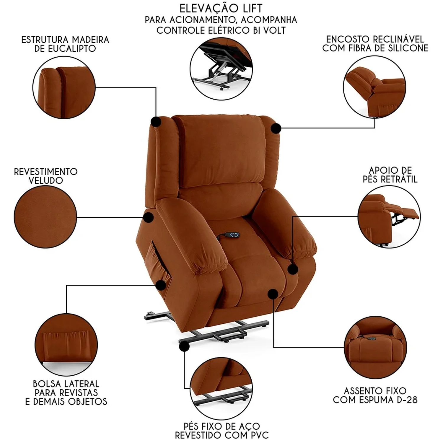 Com seu revestimento de qualidade, ela não só oferece uma superfície fácil de limpar, mas também um toque de sofisticação ao ambiente. Produzida com estrutura em eucalipto, assento em espuma D28 e molas, encosto em fibra de silicone são materiais que garantem mais qualidade e durabilidade a peça. O mecanismo LIFT é um exemplo de inovação, permitindo um ajuste suave da inclinação e elevação da poltrona, tornando-a ideal para aqueles que buscam alívio e suporte após um longo dia. Seja mergulhando nas páginas de uma revista, um bom livro que pode ficar no bolso lateral ou se deliciando com seus filmes e séries prediletos. A Poltrona Pós Operatório traz funcionalidade de elevação benéfica para evitar a força nos joelhos na hora de se levantar, para pessoas que enfrentam desafios de mobilidade, idosos ou gestantes, facilitando o movimento de sentar e levantar sem esforço adicional. A característica bivolt da Poltrona Do Papai com controle assegura que ela possa ser utilizada em diversos ambientes, adaptando-se a diferentes necessidades elétricas sem a preocupação de incompatibilidade de tensão. O apoio para os pés, que se eleva em conjunto com o encosto, é projetado para promover uma postura ergonômica, aliviando a tensão nas pernas e na lombar, enquanto os braços largos oferecem um suporte adicional e um conforto extra durante o uso.