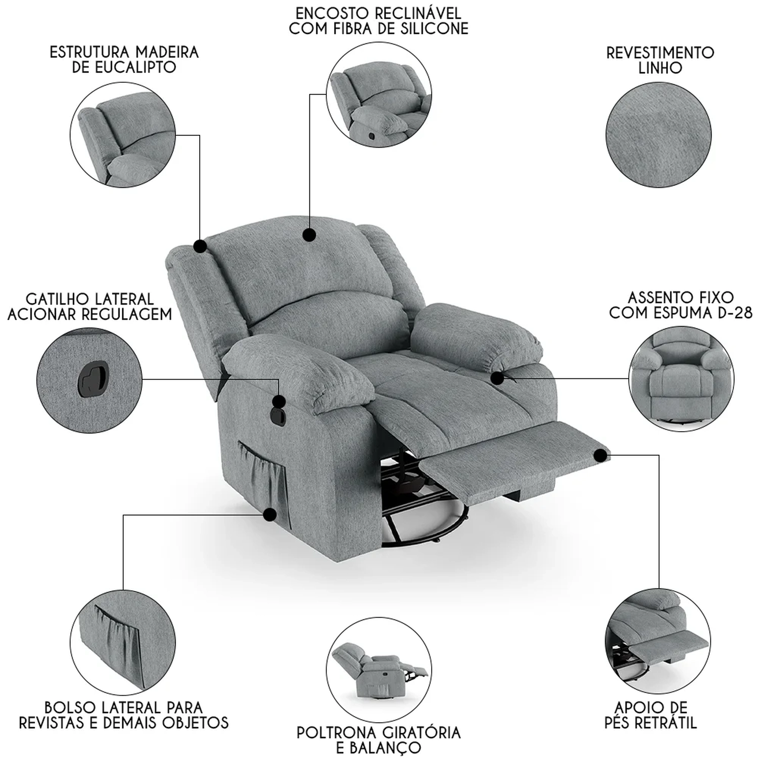 Com seu design moderno e elegante, ela não só complementa a decoração de sua casa, mas também oferece um conforto inigualável. Seja mergulhando nas páginas de uma revista, um bom livro que pode ficar no bolso lateral ou se deliciando com seus filmes e séries prediletos, essa Poltrona Reclinável será o seu refúgio particular. A combinação do sistema glider ao encosto e apoio para os pés ativados com mecanismo manual proporcionam uma experiência de relaxamento total, pois ela é giratória e possui balanço. Fabricada com materiais de alta qualidade, como a madeira de eucalipto e espuma D-28, ela garante durabilidade e suporte. Além disso o revestimento de alta qualidade é um detalhe que enriquece ainda mais a sua experiência. Não deixe escapar a chance de elevar sua sala de estar a um novo patamar de conforto e estilo com a Poltrona Do Papai.