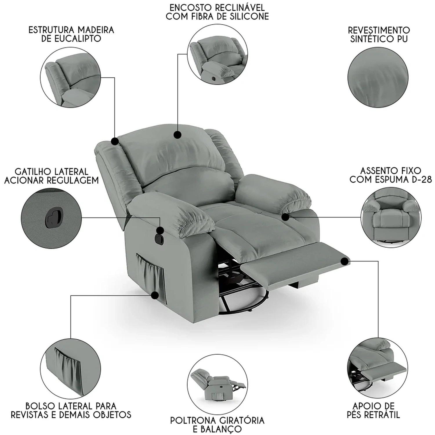 Transforme a sua Sala De Estar em um espaço de entretenimento comparável a uma sala de cinema privada! A Poltrona do Papai Reclinável Pietra Glider Giratória FH9 PU Cinza, da Mpozenato é a adição perfeita para alcançar esse sonho.