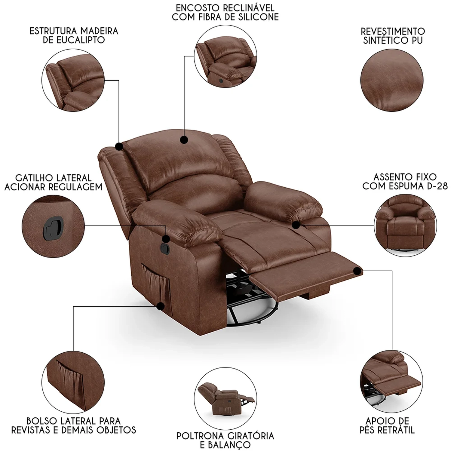 Transforme a sua Sala De Estar em um espaço de entretenimento comparável a uma sala de cinema privada! A Poltrona do Papai Reclinável Pietra Glider Giratória FH9 PU Marrom Brilho, da Mpozenato é a adição perfeita para alcançar esse sonho.
