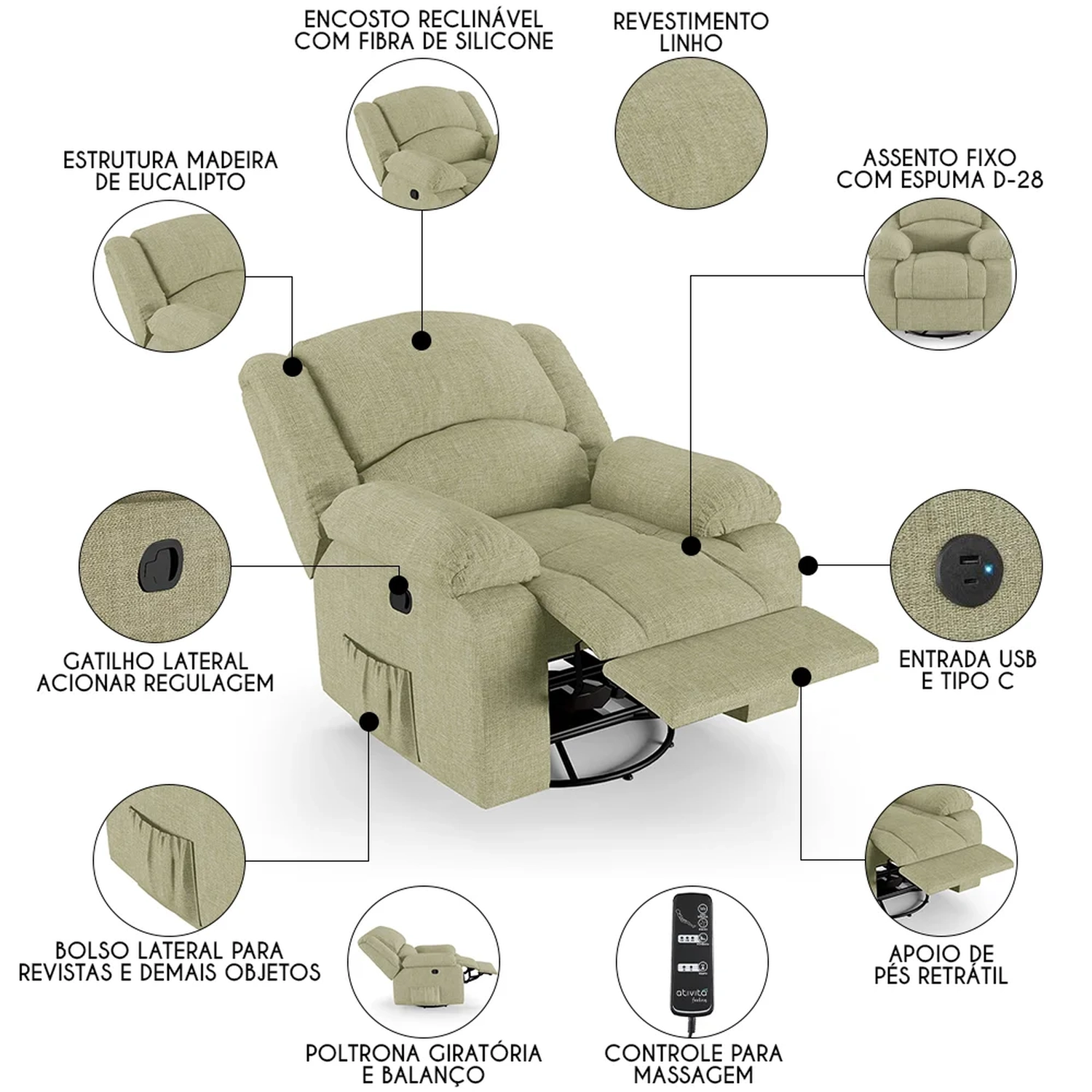 A Poltrona do Papai Reclinável Pietra Glider Giratória Massagem FH9 Linho Bege, da Mpozenato é a adição perfeita para você que quer transformar a sua Sala De Estar em um espaço de entretenimento comparável a uma sala de cinema privada!