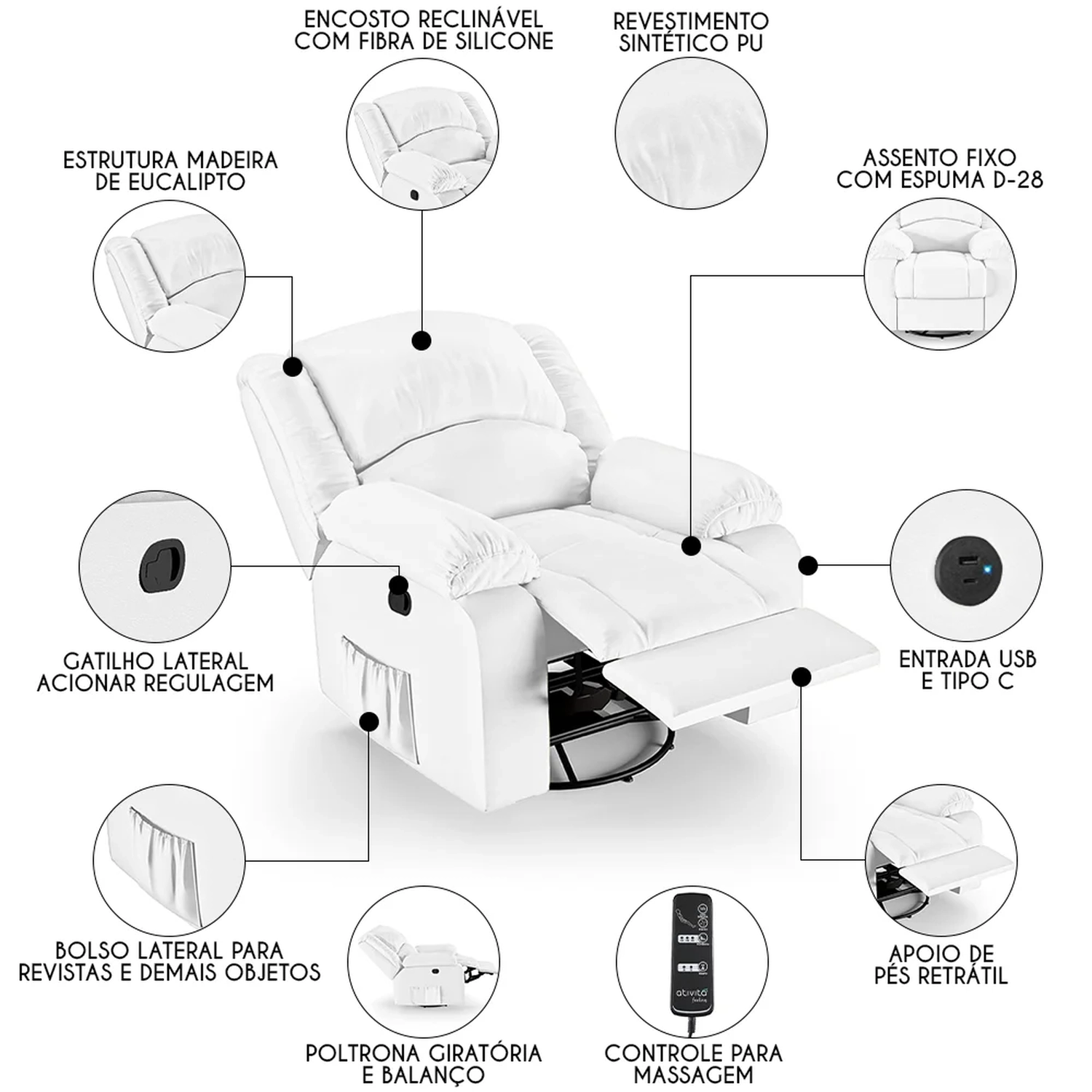 Com seu design moderno e elegante, ela não só complementa a decoração de sua casa, mas também oferece um conforto inigualável. Seja mergulhando nas páginas de um bom livro ou se deliciando com seus filmes e séries prediletos, essa Poltrona Massageadora será o seu refúgio particular. A combinação do sistema glider ao encosto e apoio para os pés ativados com mecanismo manual proporcionam uma experiência de relaxamento total, pois ela é giratória com balanço, e acompanha controle para acionar a massagem. Ah! E ela ainda conta com entrada USB e tipo C ideal para carregar seus eletrônicos enquanto descansa. Fabricada com materiais de alta qualidade, como a madeira de eucalipto e espuma D-28, ela garante durabilidade e suporte. Além disso o revestimento de alta qualidade é um detalhe que enriquece ainda mais a sua experiência. Não deixe escapar a chance de elevar sua sala de estar a um novo patamar de conforto e estilo com a Poltrona Do Papai.