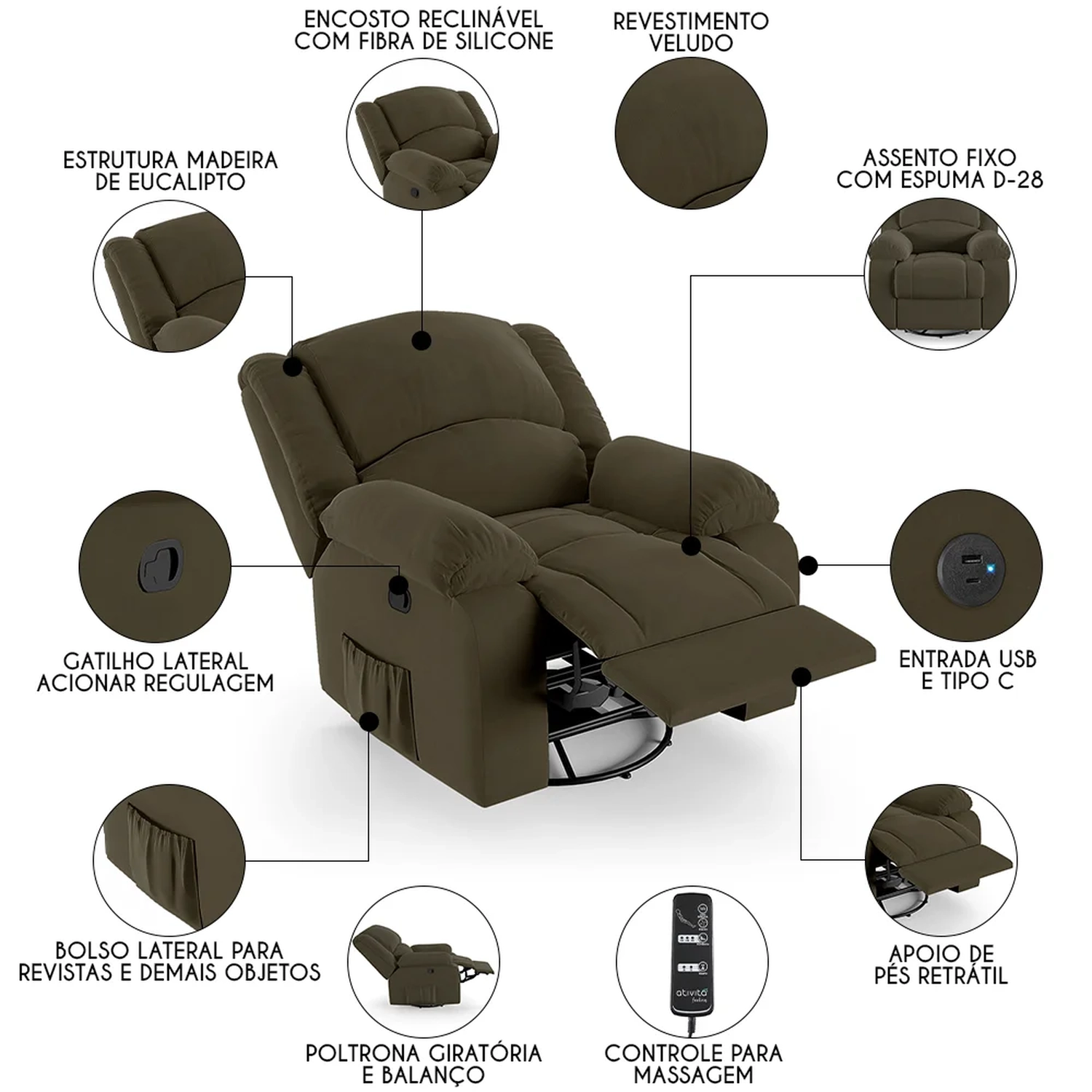 Com seu design moderno e elegante, ela não só complementa a decoração de sua casa, mas também oferece um conforto inigualável. Seja mergulhando nas páginas de um bom livro ou se deliciando com seus filmes e séries prediletos, essa Poltrona Massageadora será o seu refúgio particular. A combinação do sistema glider ao encosto e apoio para os pés ativados com mecanismo manual proporcionam uma experiência de relaxamento total, pois ela é giratória com balanço, e acompanha controle para acionar a massagem. Ah! E ela ainda conta com entrada USB e tipo C ideal para carregar seus eletrônicos enquanto descansa. Fabricada com materiais de alta qualidade, como a madeira de eucalipto e espuma D-28, ela garante durabilidade e suporte. Além disso o revestimento de alta qualidade é um detalhe que enriquece ainda mais a sua experiência. Não deixe escapar a chance de elevar sua sala de estar a um novo patamar de conforto e estilo com a Poltrona Do Papai.