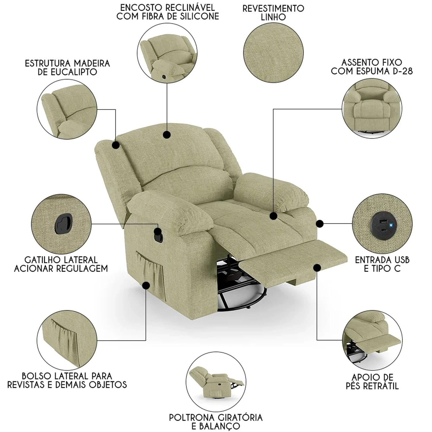Com seu design moderno e elegante, ela não só complementa a decoração de sua casa, mas também oferece um conforto inigualável. Seja mergulhando nas páginas de um bom livro ou se deliciando com seus filmes e séries prediletos, essa Poltrona Reclinável será o seu refúgio particular. A combinação do sistema glider ao encosto e apoio para os pés ativados com mecanismo manual proporcionam uma experiência de relaxamento total, pois ela é giratória e possui balanço. Ah! E ela ainda conta com entrada USB e tipo C ideal para carregar seus eletrônicos enquanto descansa. Fabricada com materiais de alta qualidade, como a madeira de eucalipto e espuma D-28, ela garante durabilidade e suporte. Além disso o revestimento de alta qualidade é um detalhe que enriquece ainda mais a sua experiência. Não deixe escapar a chance de elevar sua sala de estar a um novo patamar de conforto e estilo com a Poltrona Do Papai.