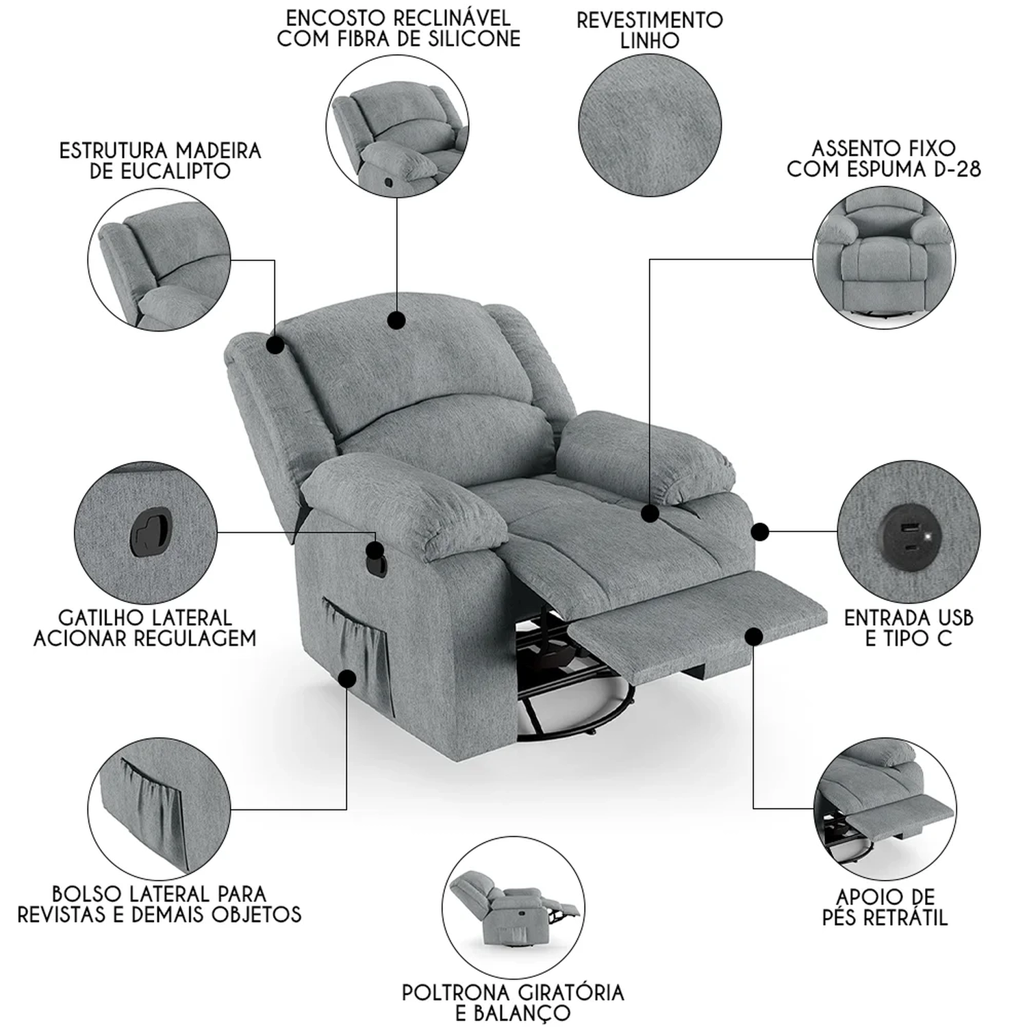 Com seu design moderno e elegante, ela não só complementa a decoração de sua casa, mas também oferece um conforto inigualável. Seja mergulhando nas páginas de um bom livro ou se deliciando com seus filmes e séries prediletos, essa Poltrona Reclinável será o seu refúgio particular. A combinação do sistema glider ao encosto e apoio para os pés ativados com mecanismo manual proporcionam uma experiência de relaxamento total, pois ela é giratória e possui balanço. Ah! E ela ainda conta com entrada USB e tipo C ideal para carregar seus eletrônicos enquanto descansa. Fabricada com materiais de alta qualidade, como a madeira de eucalipto e espuma D-28, ela garante durabilidade e suporte. Além disso o revestimento de alta qualidade é um detalhe que enriquece ainda mais a sua experiência. Não deixe escapar a chance de elevar sua sala de estar a um novo patamar de conforto e estilo com a Poltrona Do Papai.