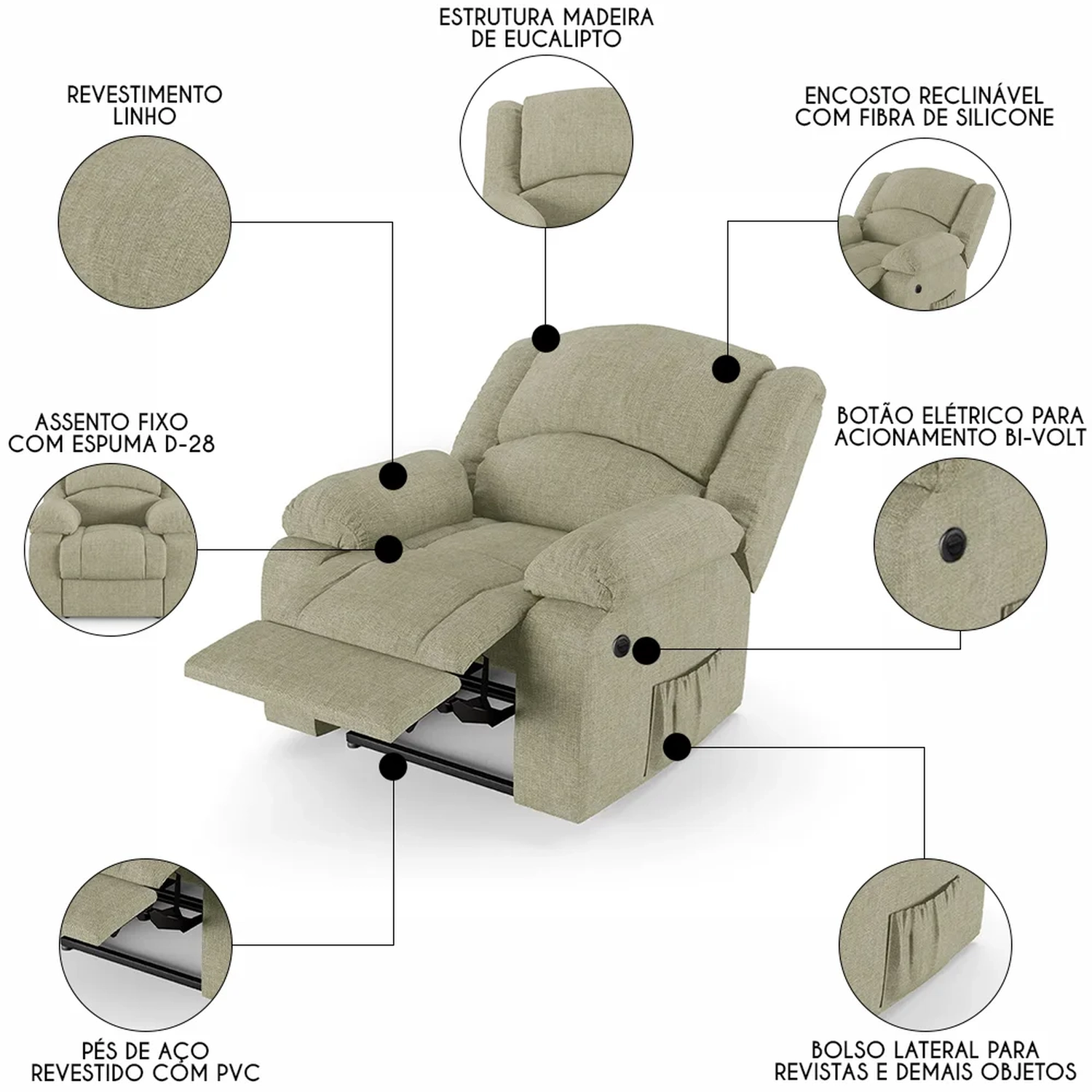 Transforme sua Sala De Estar em um espaço de entretenimento de última geração com a Poltrona do Papai Reclinável Pietra Power Elétrica FH9 Linho Bege, da Mpozenato!