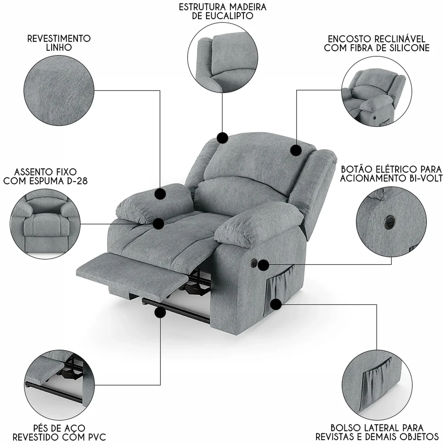 Poltrona do Papai Reclinável Pietra Power Elétrica FH9 Linho Cinza - Mpozenato