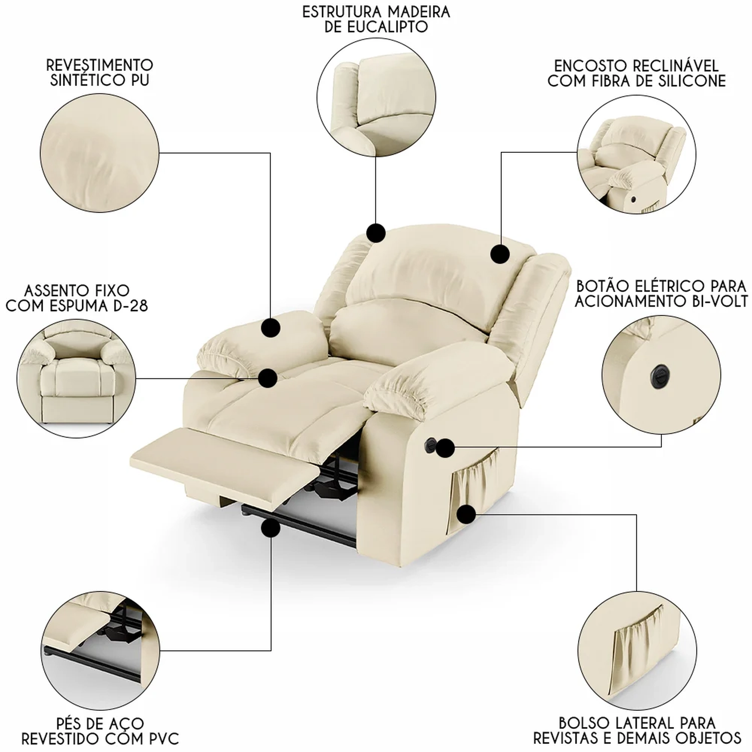 Transforme sua Sala De Estar em um espaço de entretenimento de última geração com a Poltrona do Papai Reclinável Pietra Power Elétrica FH9 PU Bege, da Mpozenato!