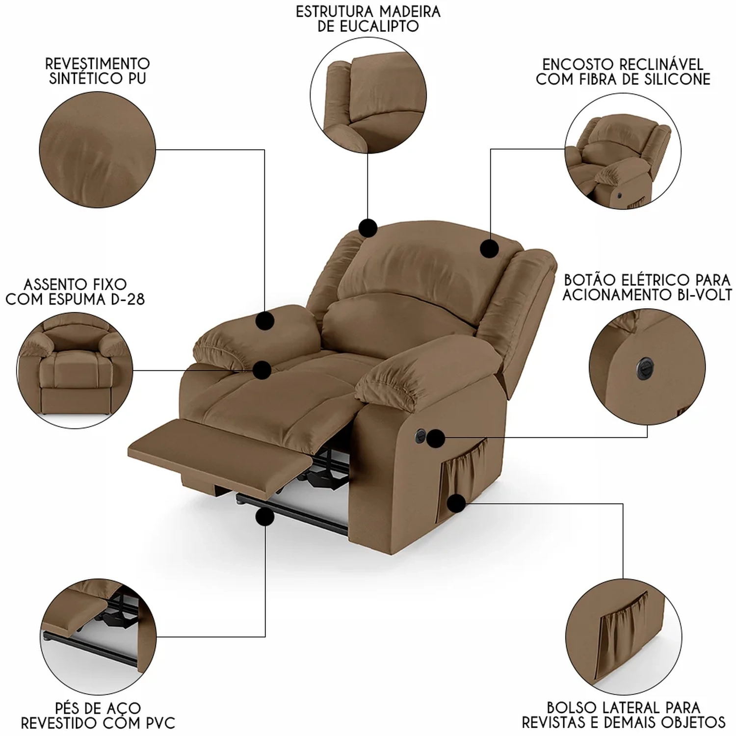 Transforme sua Sala De Estar em um espaço de entretenimento de última geração com a Poltrona do Papai Reclinável Pietra Power Elétrica FH9 PU Caramelo, da Mpozenato!