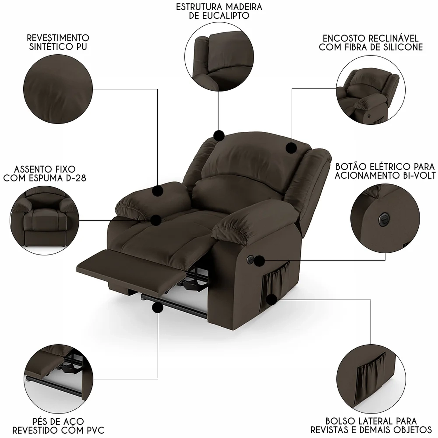 Transforme sua Sala De Estar em um espaço de entretenimento de última geração com a Poltrona do Papai Reclinável Pietra Power Elétrica FH9 PU Marrom, da Mpozenato!