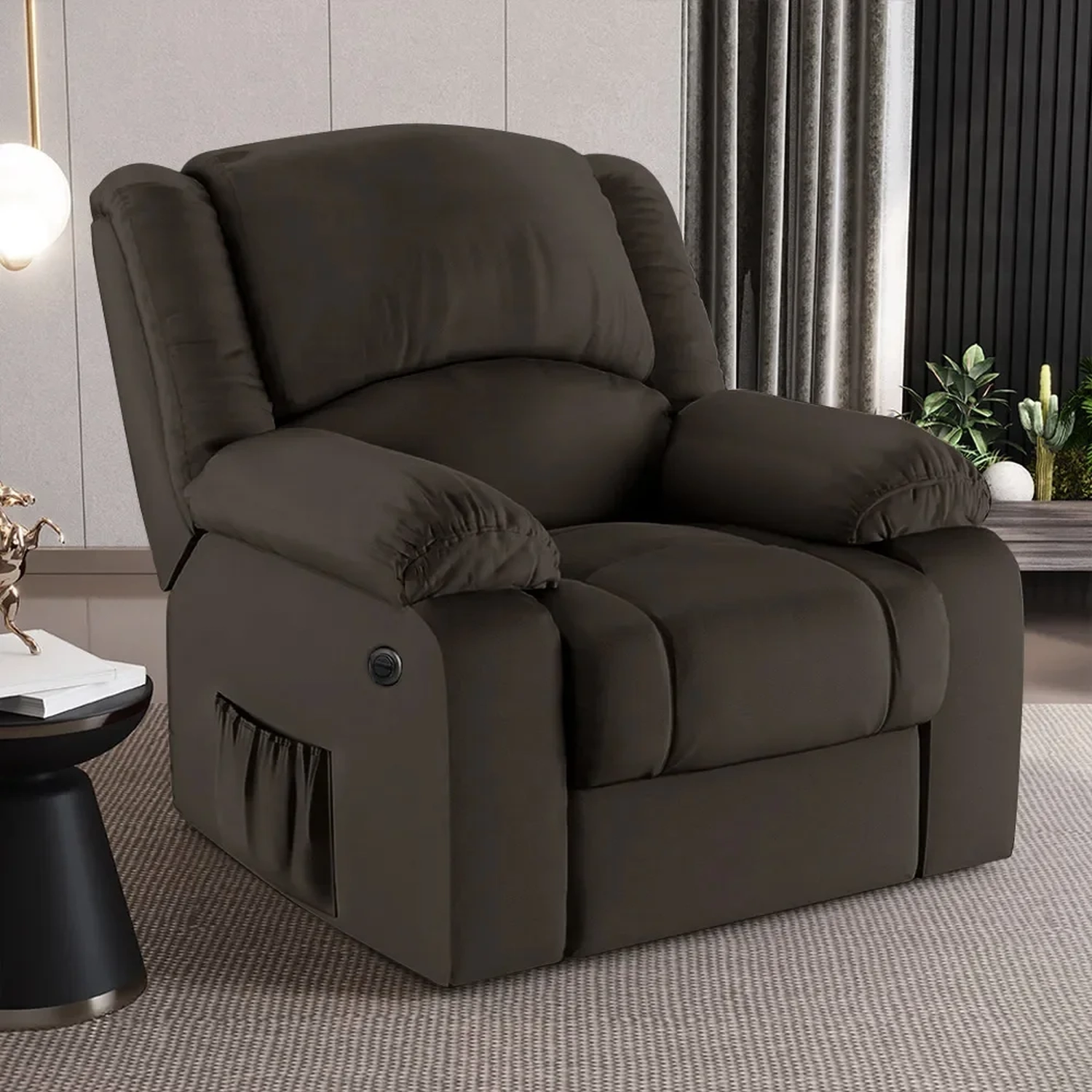 Com um design que alia modernidade e elegância, a Poltrona Reclinável é a escolha perfeita para aqueles que não abrem mão do conforto supremo. Seja mergulhando nas páginas de uma revista, um bom livro que pode ficar no bolso lateral ou se deliciando com seus filmes e séries prediletos, esta Poltrona Do Papai promete ser o seu refúgio particular. A facilidade de ajuste com o botão elétrico permite que você encontre a posição perfeita com o toque de um botão, pensado para proporcionar uma experiência imersiva sem igual. E não é só sobre conforto, mas também sobre durabilidade e estilo, como a madeira maciça de eucalipto e o revestimento de alta qualidade. As dimensões generosas garantem que você tenha espaço de sobra para relaxar, enquanto a capacidade de suportar até 130kg assegura que é uma peça robusta e confiável. Não é apenas uma poltrona, é um upgrade na sua qualidade de vida, trazendo o glamour do cinema diretamente para o seu lar.