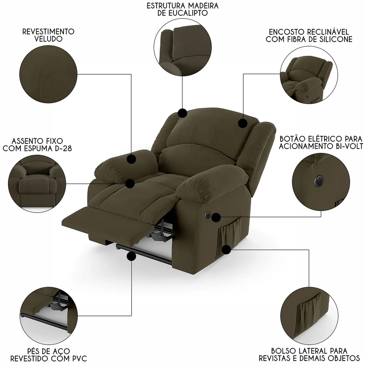 Com um design que alia modernidade e elegância, a Poltrona Reclinável é a escolha perfeita para aqueles que não abrem mão do conforto supremo. Seja mergulhando nas páginas de uma revista, um bom livro que pode ficar no bolso lateral ou se deliciando com seus filmes e séries prediletos, esta Poltrona Do Papai promete ser o seu refúgio particular. A facilidade de ajuste com o botão elétrico permite que você encontre a posição perfeita com o toque de um botão, pensado para proporcionar uma experiência imersiva sem igual. E não é só sobre conforto, mas também sobre durabilidade e estilo, como a madeira maciça de eucalipto e o revestimento de alta qualidade. As dimensões generosas garantem que você tenha espaço de sobra para relaxar, enquanto a capacidade de suportar até 130kg assegura que é uma peça robusta e confiável. Não é apenas uma poltrona, é um upgrade na sua qualidade de vida, trazendo o glamour do cinema diretamente para o seu lar.