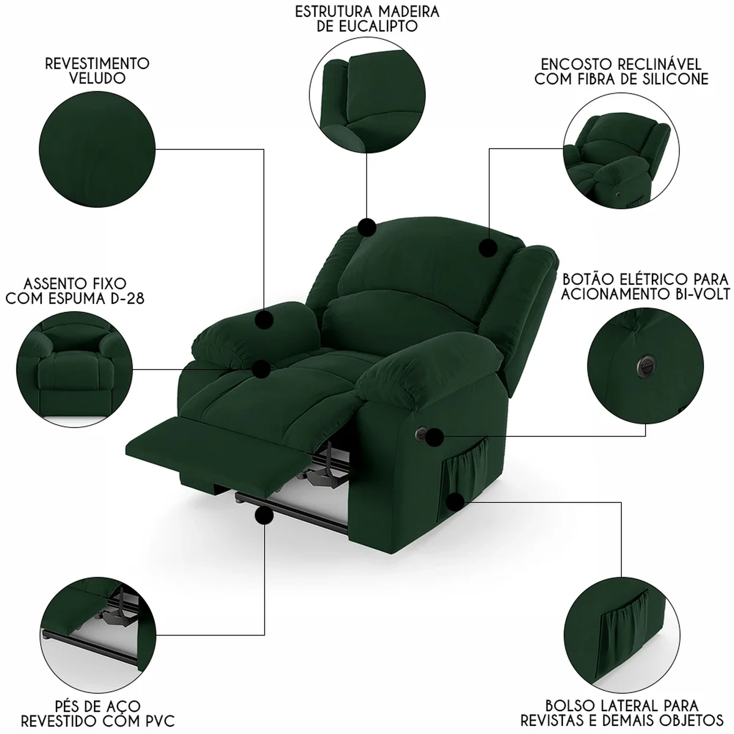 Transforme sua Sala De Estar em um espaço de entretenimento de última geração com a Poltrona do Papai Reclinável Pietra Power Elétrica FH9 Veludo Verde, da Mpozenato!
