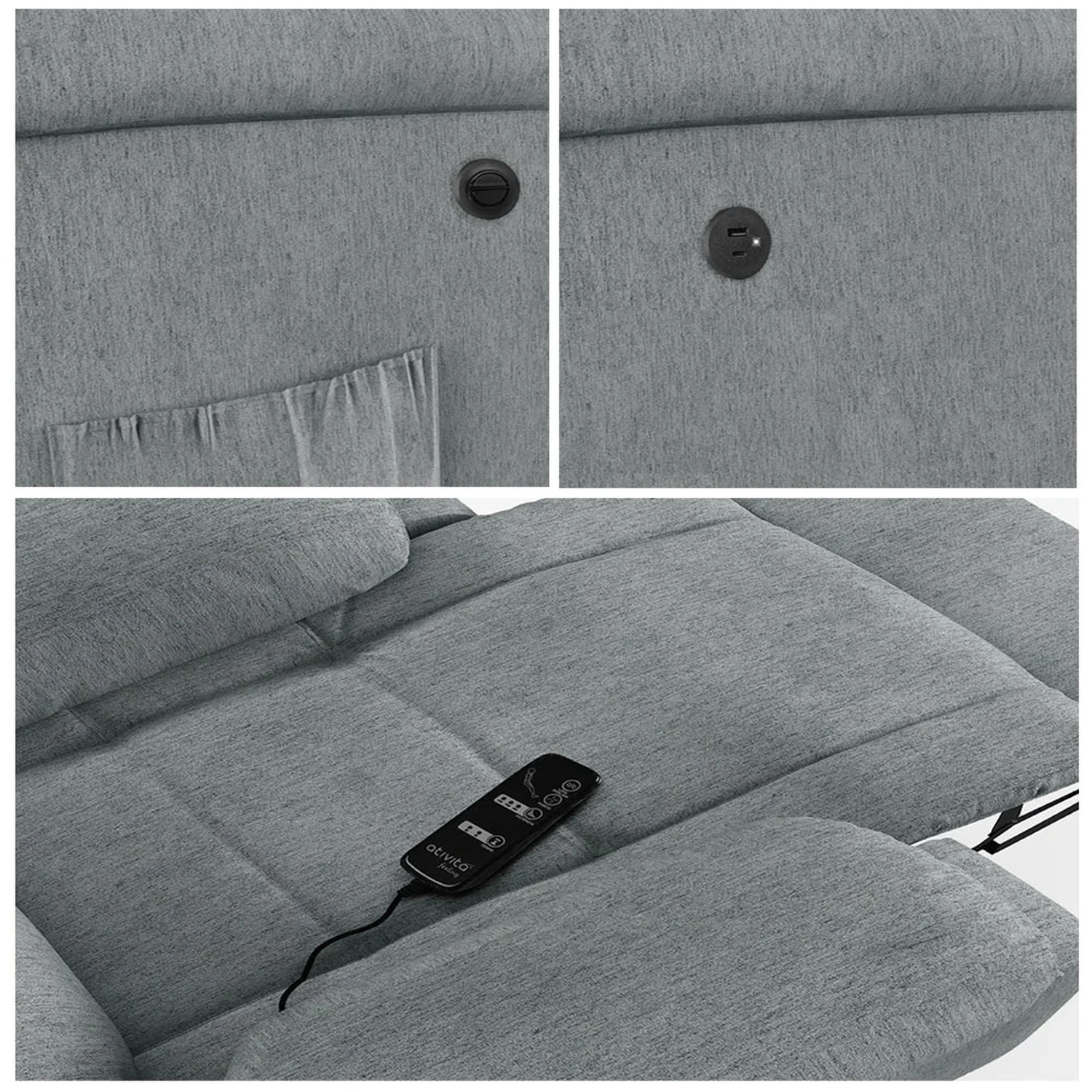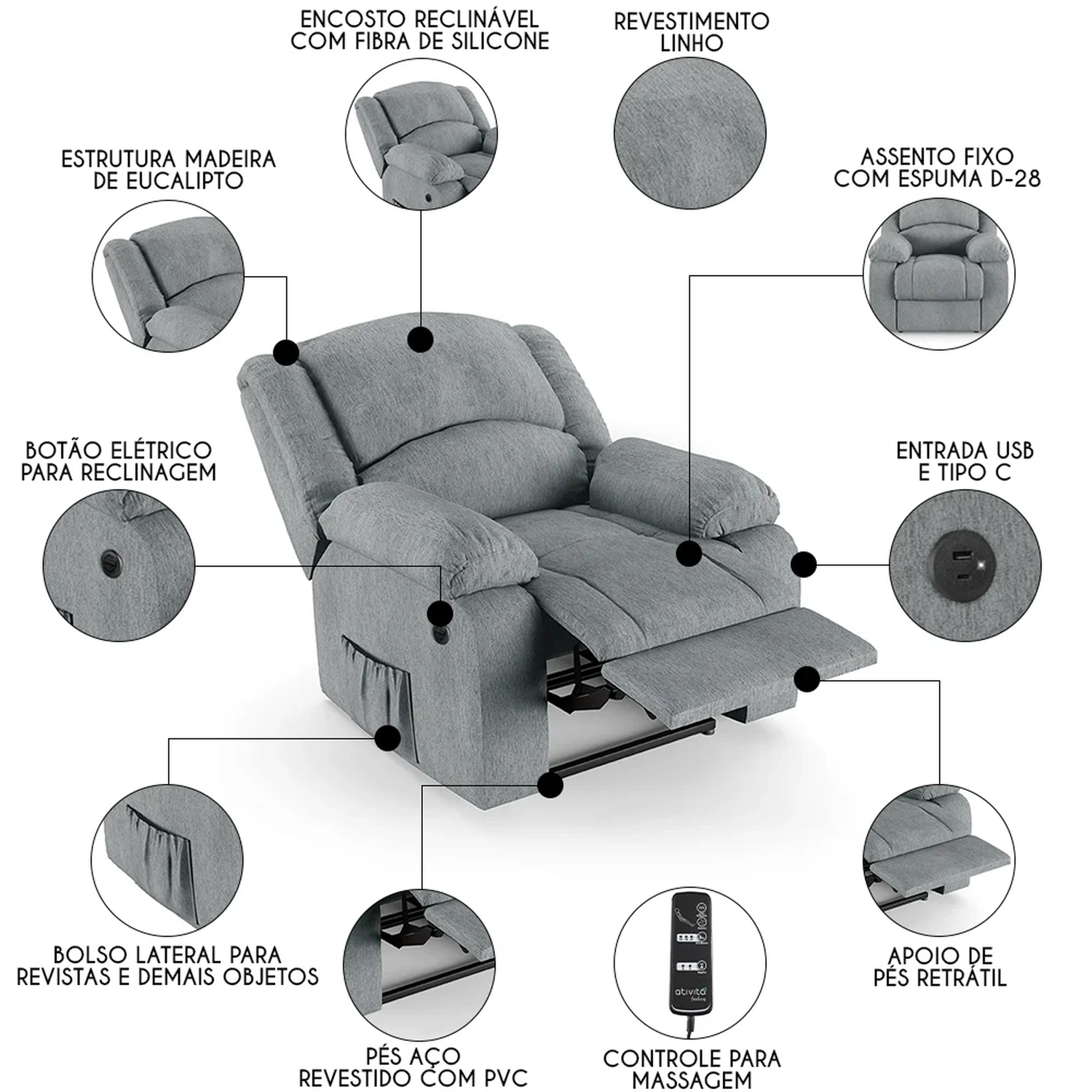 Mecanismo: Botão Elétrico, controle de massagem e entrada USB Bi-volt.