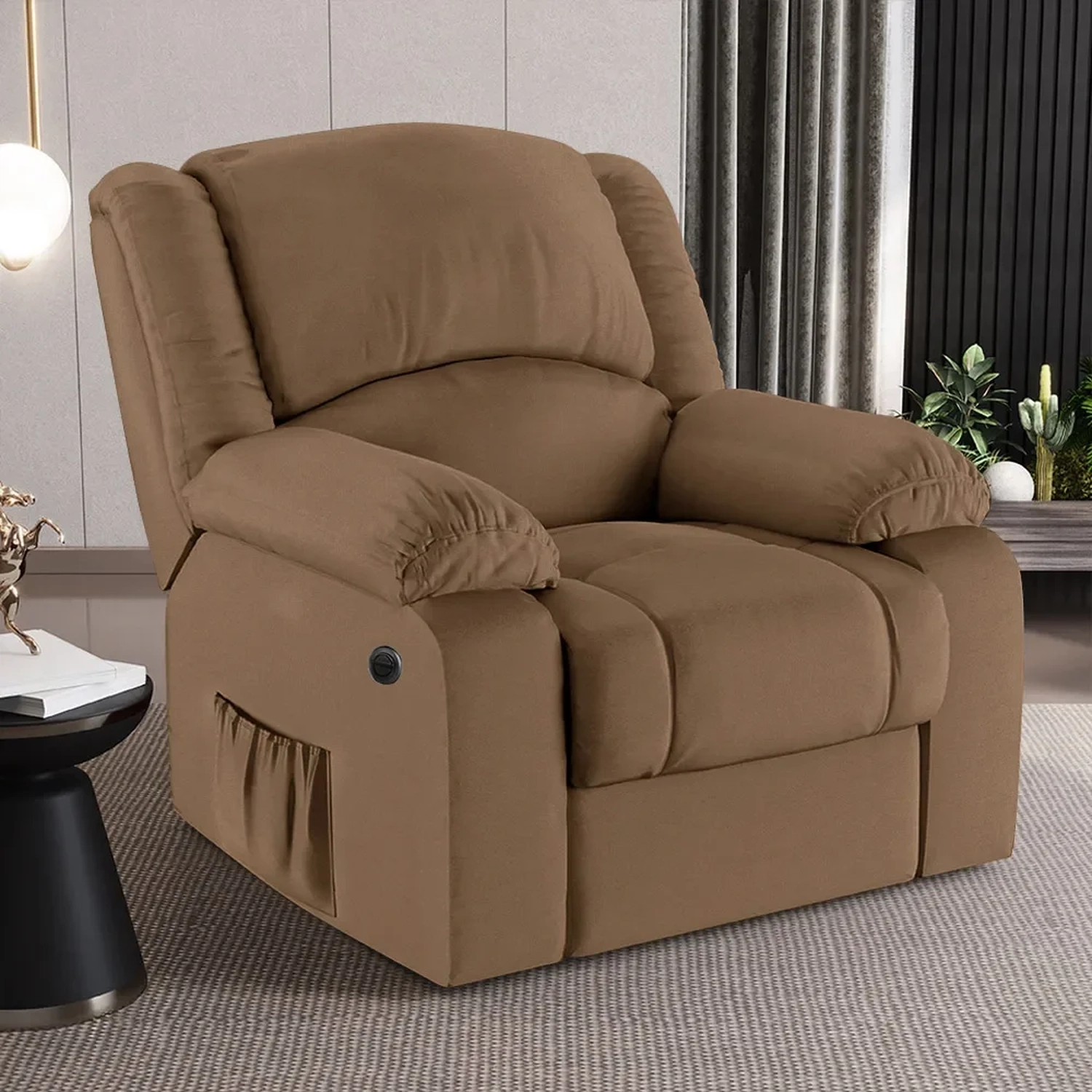 Com um design que alia modernidade e elegância, a Poltrona Reclinável é a escolha perfeita para aqueles que não abrem mão do conforto supremo. Seja mergulhando nas páginas de uma revista, um bom livro que pode ficar no bolso lateral ou se deliciando com seus filmes e séries prediletos, esta Poltrona Do Papai promete ser o seu refúgio particular. A facilidade de ajuste com o botão elétrico permite que você encontre a posição perfeita com o toque de um botão. Ah! E ela ainda conta com entrada USB e tipo C ideal para carregar seus eletrônicos enquanto descansa, tudo pensado para proporcionar uma experiência imersiva sem igual. E não é só sobre conforto, mas também sobre durabilidade e estilo, como a madeira maciça de eucalipto e o revestimento de alta qualidade. As dimensões generosas garantem que você tenha espaço de sobra para relaxar, enquanto a capacidade de suportar até 130kg assegura que é uma peça robusta e confiável. Não é apenas uma poltrona, é um upgrade na sua qualidade de vida, trazendo o glamour do cinema diretamente para o seu lar.