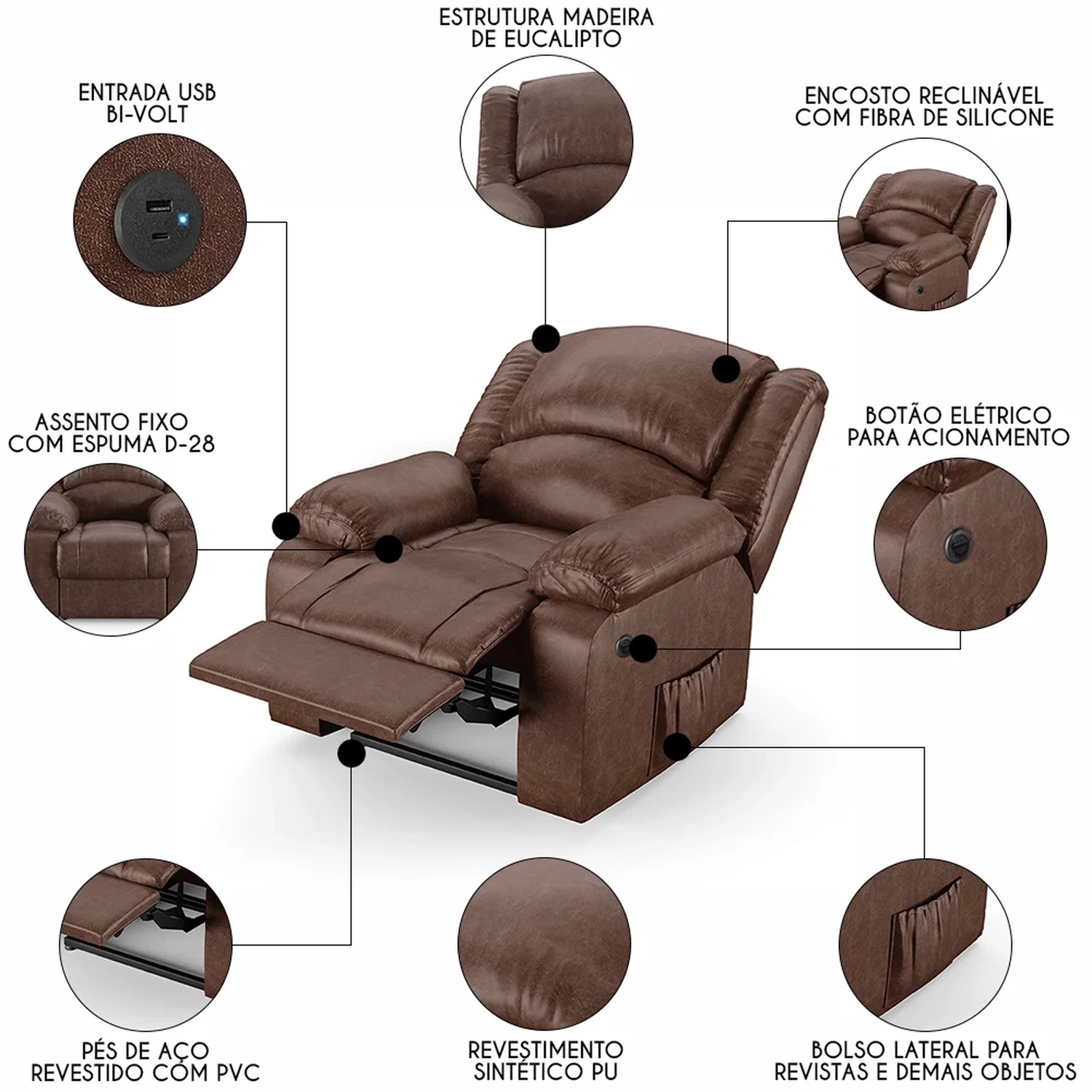 Hora de inovar a sua Sala de Estar com a Poltrona do Papai Reclinável Pietra Power Elétrica USB FH9 PU Marrom Brilho, da Mpozenato!