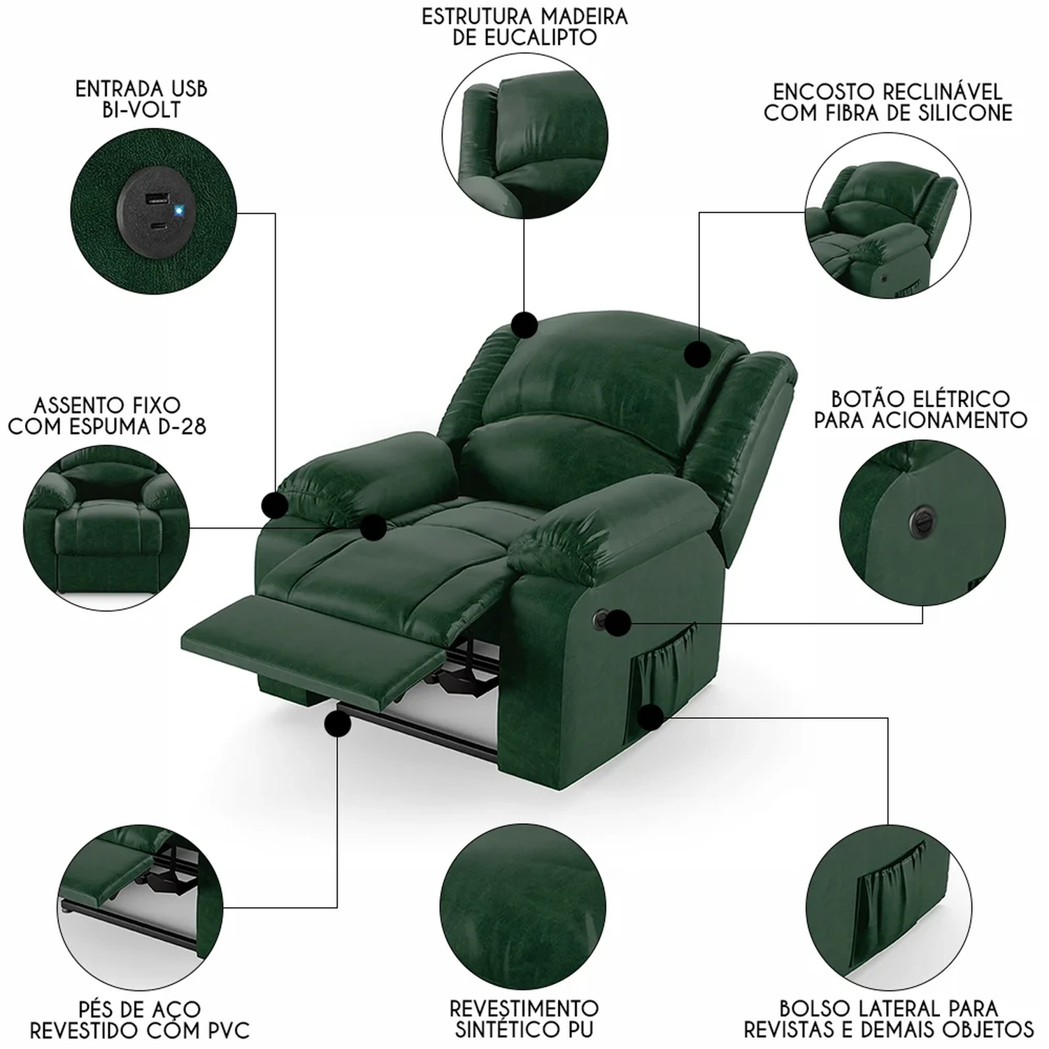 Hora de inovar a sua Sala de Estar com a Poltrona do Papai Reclinável Pietra Power Elétrica USB FH9 PU Verde Musgo, da Mpozenato!