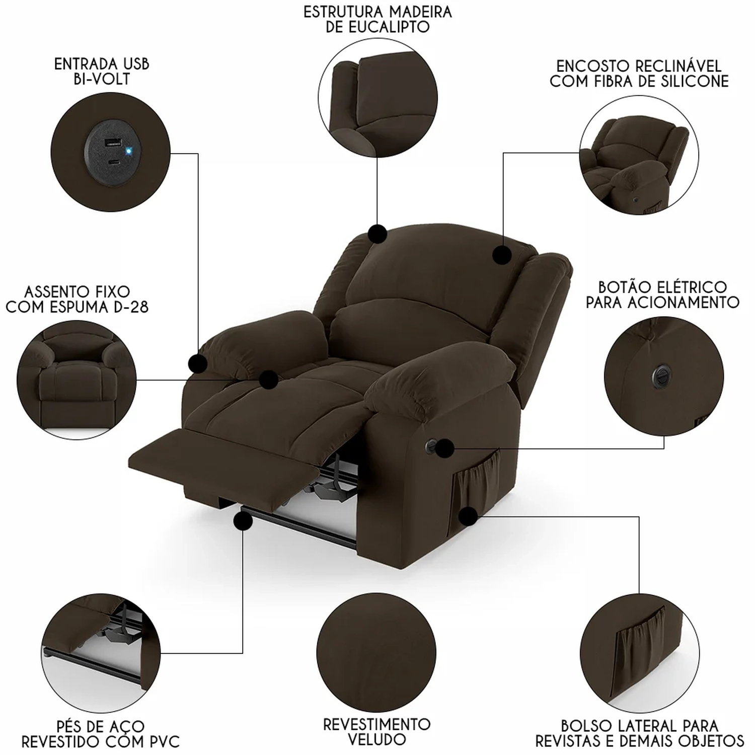 Hora de inovar a sua Sala de Estar com a Poltrona do Papai Reclinável Pietra Power Elétrica USB FH9 Veludo Marrom, da Mpozenato!