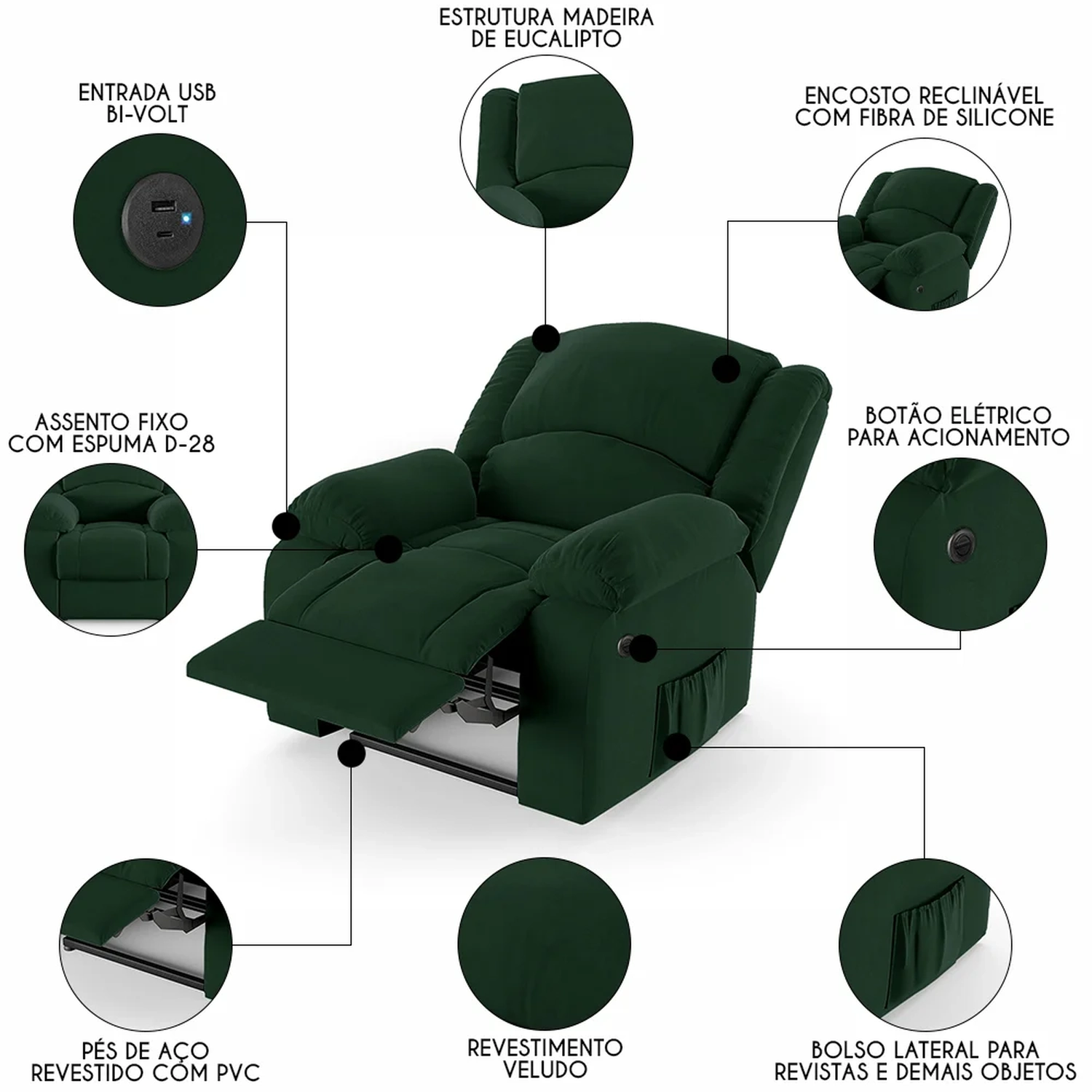 Hora de inovar a sua Sala de Estar com a Poltrona do Papai Reclinável Pietra Power Elétrica USB FH9 Veludo Verde, da Mpozenato!