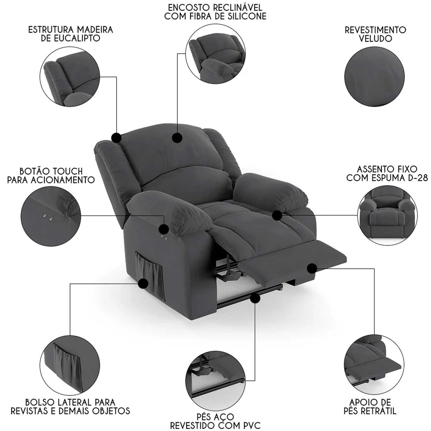 Hora de deixar a sua Sala De Estar mais moderna e transformar em um espaço de entretenimento de última geração com a Poltrona do Papai Reclinável Pietra Power Touch FH9 Veludo Cinza, da Mpozenato!