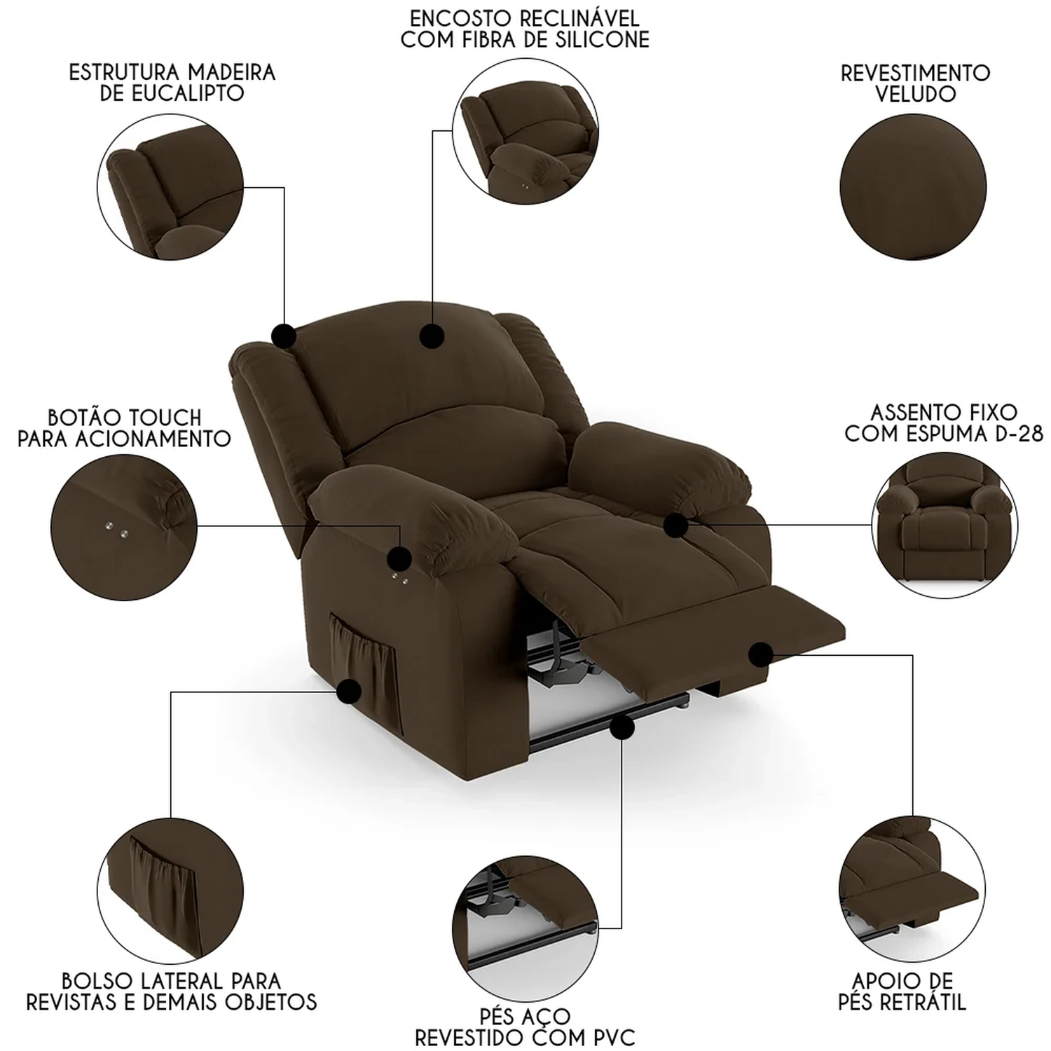 Hora de deixar a sua Sala De Estar mais moderna e transformar em um espaço de entretenimento de última geração com a Poltrona do Papai Reclinável Pietra Power Touch FH9 Veludo Marrom, da Mpozenato!