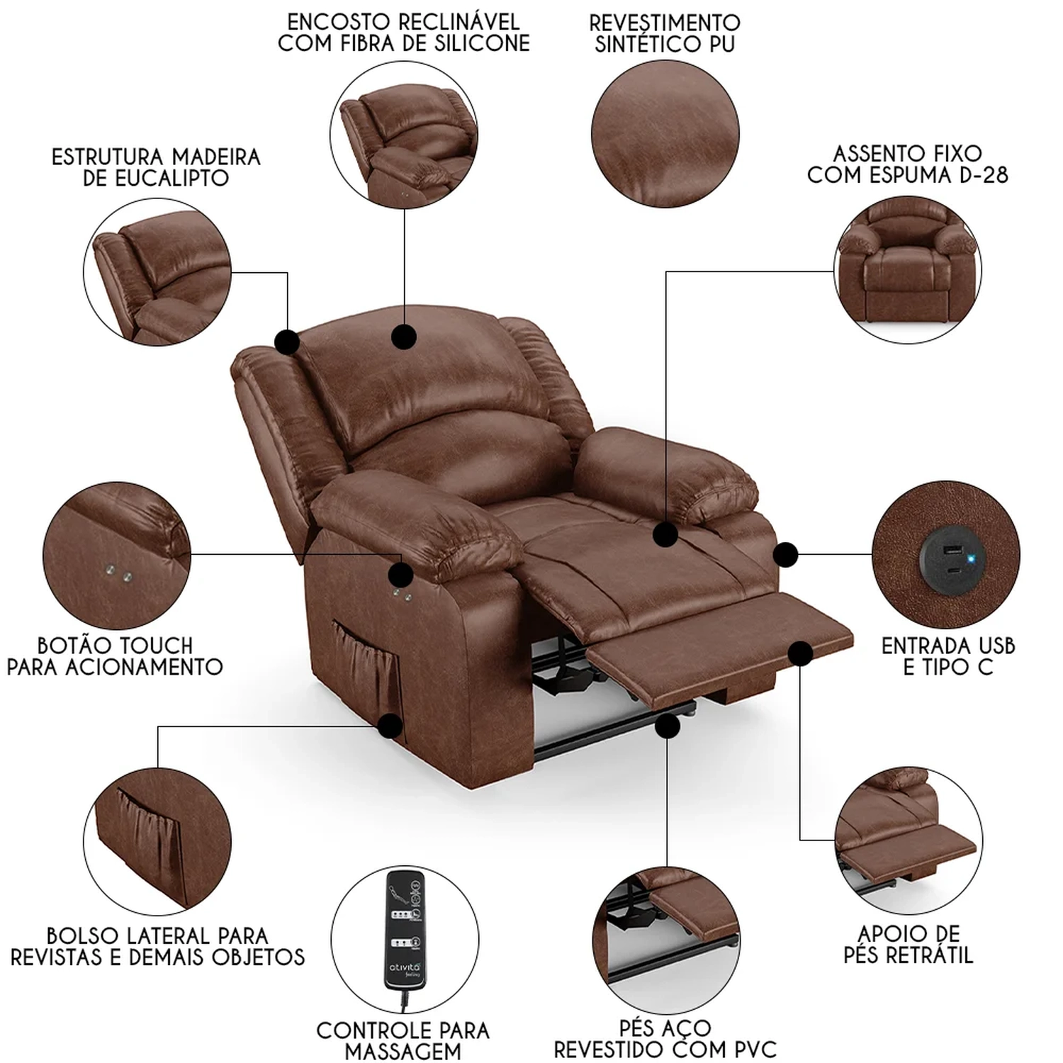Mecanismo: Botão Elétrico Touch, massagem e entrada USB.