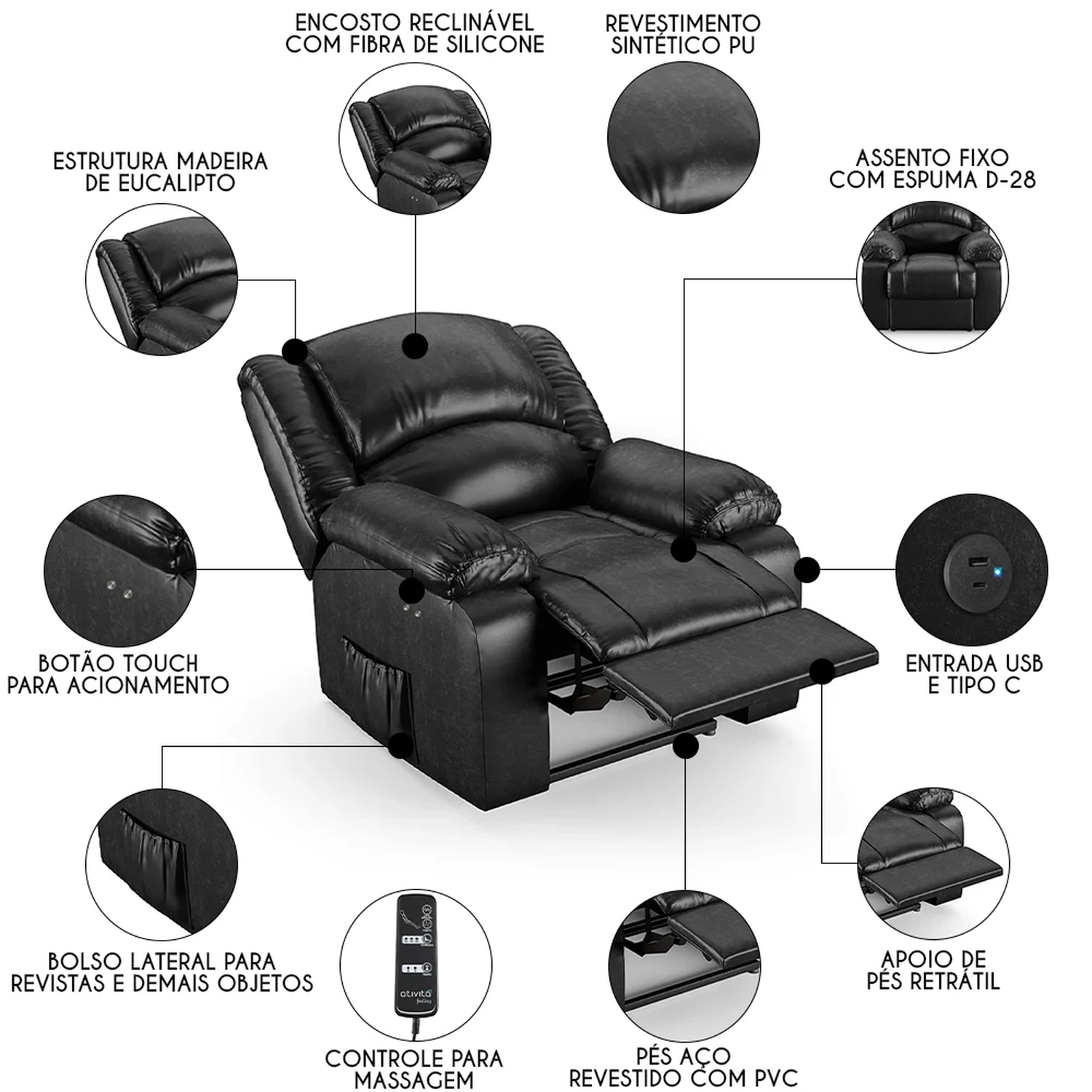 A Poltrona do Papai Reclinável Pietra Power Touch Massagem FH9 PU Preto Brilho, da Mpozenato é deal para transformar a sua Sala De Estar em um espaço confortável de entretenimento de última geração!