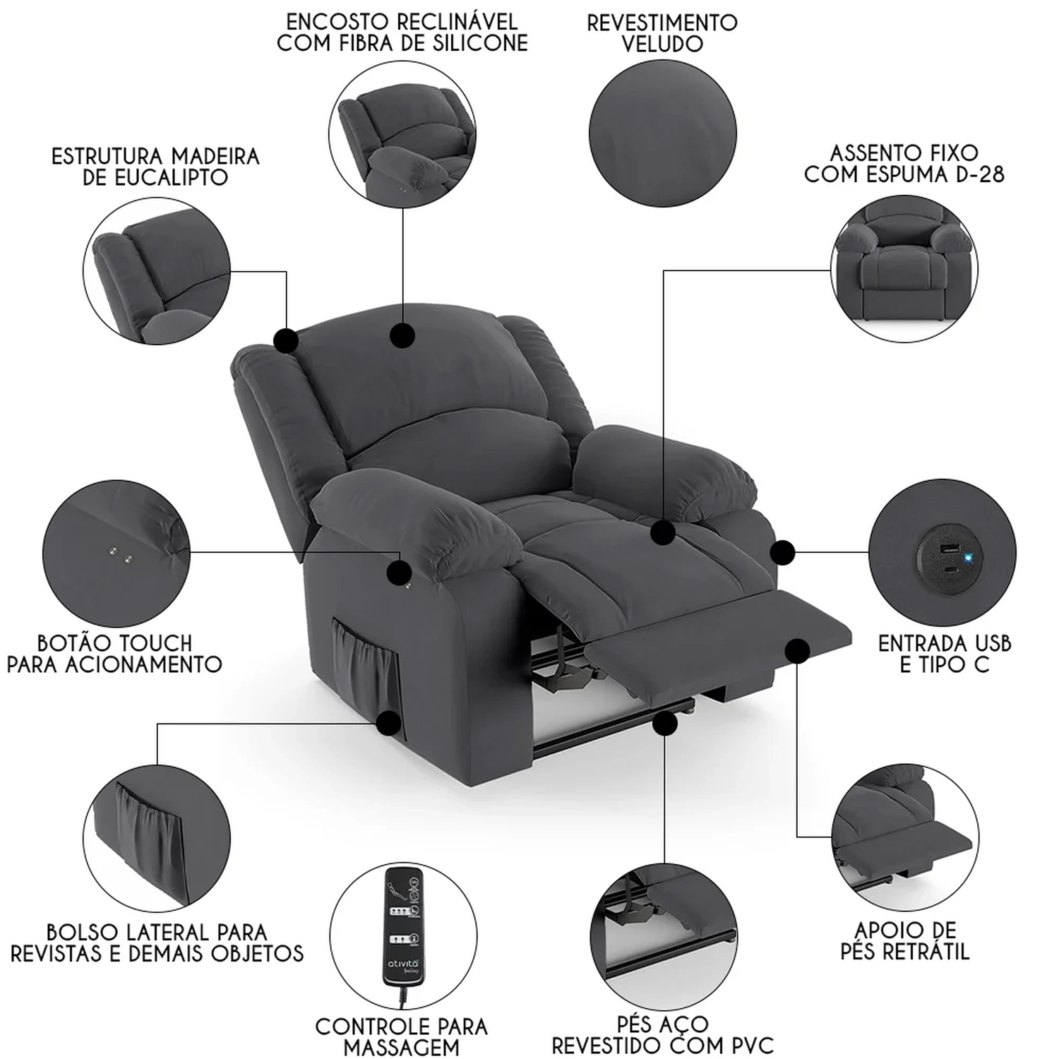 A Poltrona do Papai Reclinável Pietra Power Touch Massagem FH9 Veludo Cinza, da Mpozenato é deal para transformar a sua Sala De Estar em um espaço confortável de entretenimento de última geração!