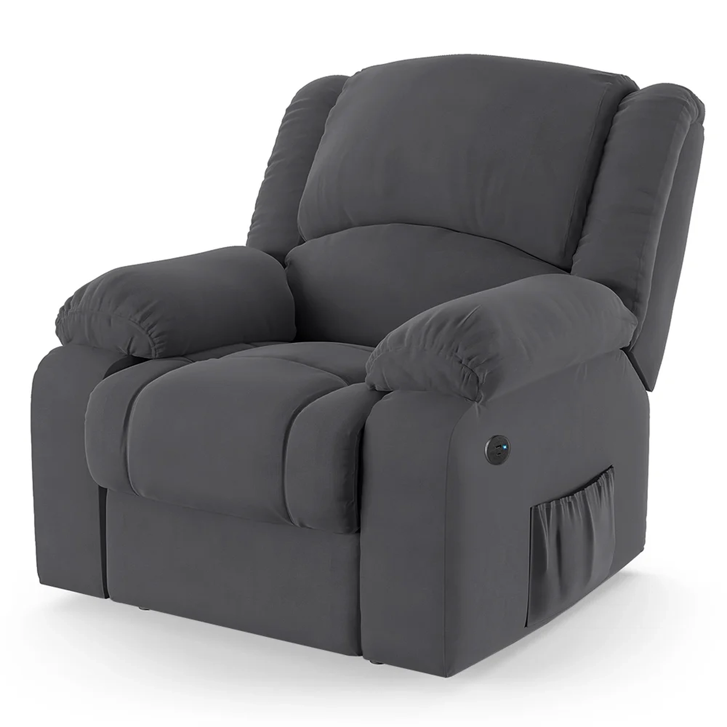 Com um design que alia modernidade e elegância, a Poltrona Reclinável é a escolha perfeita para aqueles que não abrem mão do conforto supremo. Seja mergulhando nas páginas de uma revista, um bom livro que pode ficar no bolso lateral ou se deliciando com seus filmes e séries prediletos, esta Poltrona Do Papai promete ser o seu refúgio particular. A adição do botão elétrico touch para massagem eleva o nível de relaxamento, proporcionando uma experiência de cinema com o benefício terapêutico de uma massagem. Ah! E ela ainda conta com entrada USB e tipo C ideal para carregar seus eletrônicos enquanto descansa, tudo pensado para proporcionar uma experiência imersiva sem igual. E não é só sobre conforto, mas também sobre durabilidade e estilo, como a madeira maciça de eucalipto e o revestimento de alta qualidade. As dimensões generosas garantem que você tenha espaço de sobra para relaxar, enquanto a capacidade de suportar até 130kg assegura que é uma peça robusta e confiável. Não é apenas uma Poltrona Massageadora, é um upgrade na sua qualidade de vida, trazendo o glamour do cinema diretamente para o seu lar.