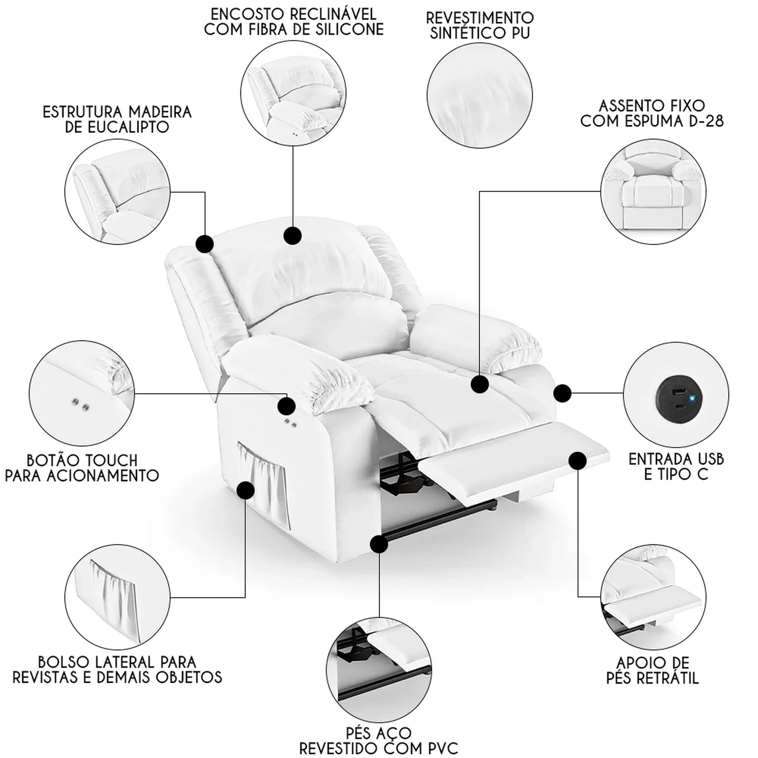 Conheça a Poltrona do Papai Reclinável Pietra Power Touch USB FH9 PU Branco, da Mpozenato. Ideal para transformar a sua Sala De Estar em um espaço de entretenimento de última geração!