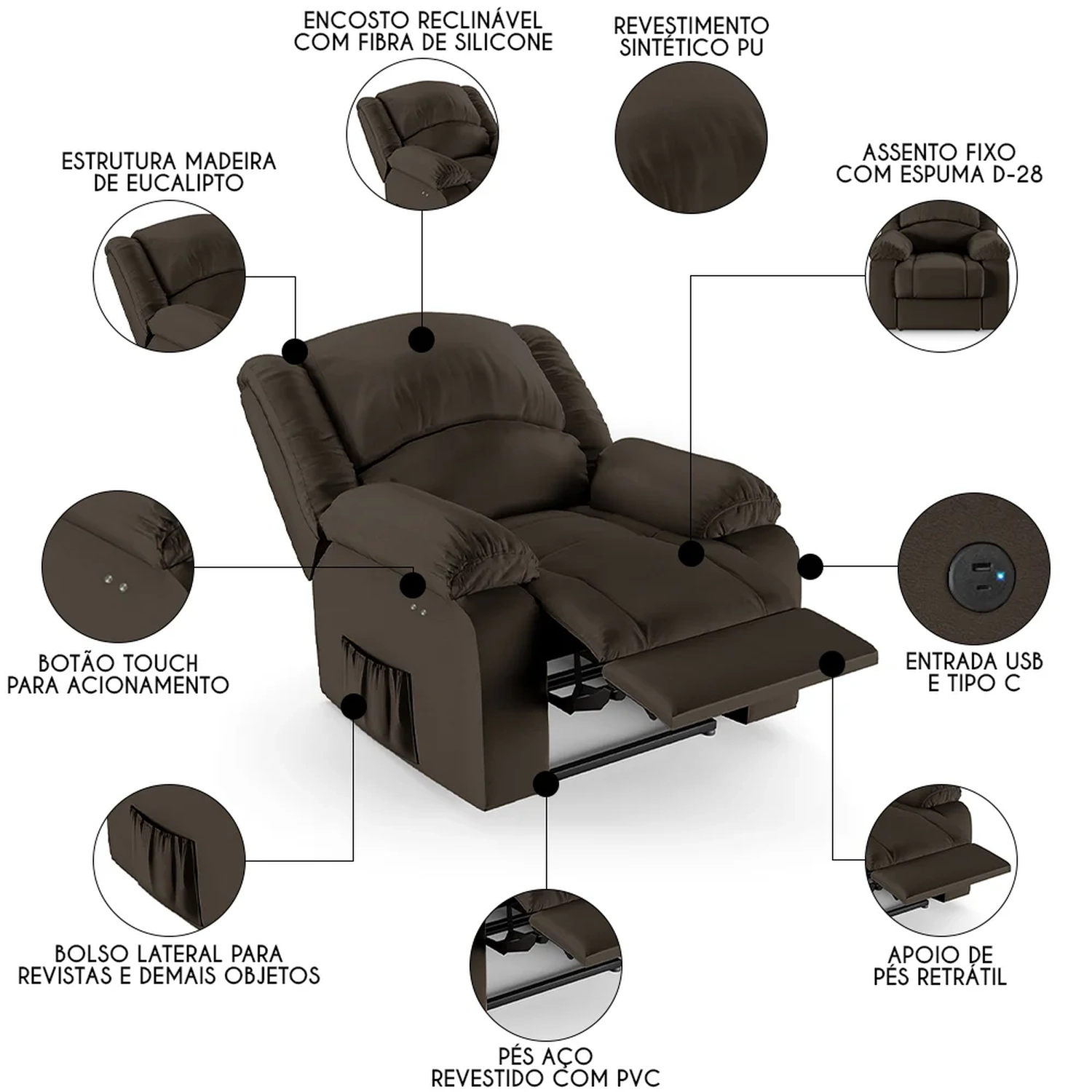 Conheça a Poltrona do Papai Reclinável Pietra Power Touch USB FH9 PU Marrom, da Mpozenato. Ideal para transformar a sua Sala De Estar em um espaço de entretenimento de última geração!
