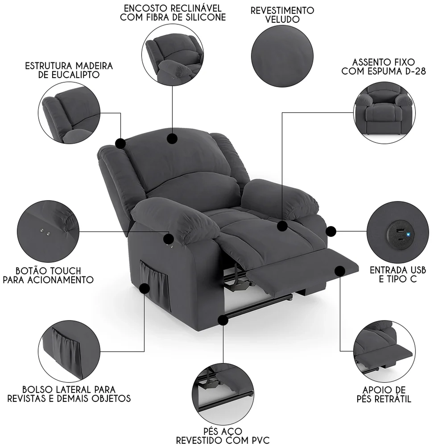 Conheça a Poltrona do Papai Reclinável Pietra Power Touch USB FH9 Veludo Cinza, da Mpozenato. Ideal para transformar a sua Sala De Estar em um espaço de entretenimento de última geração!