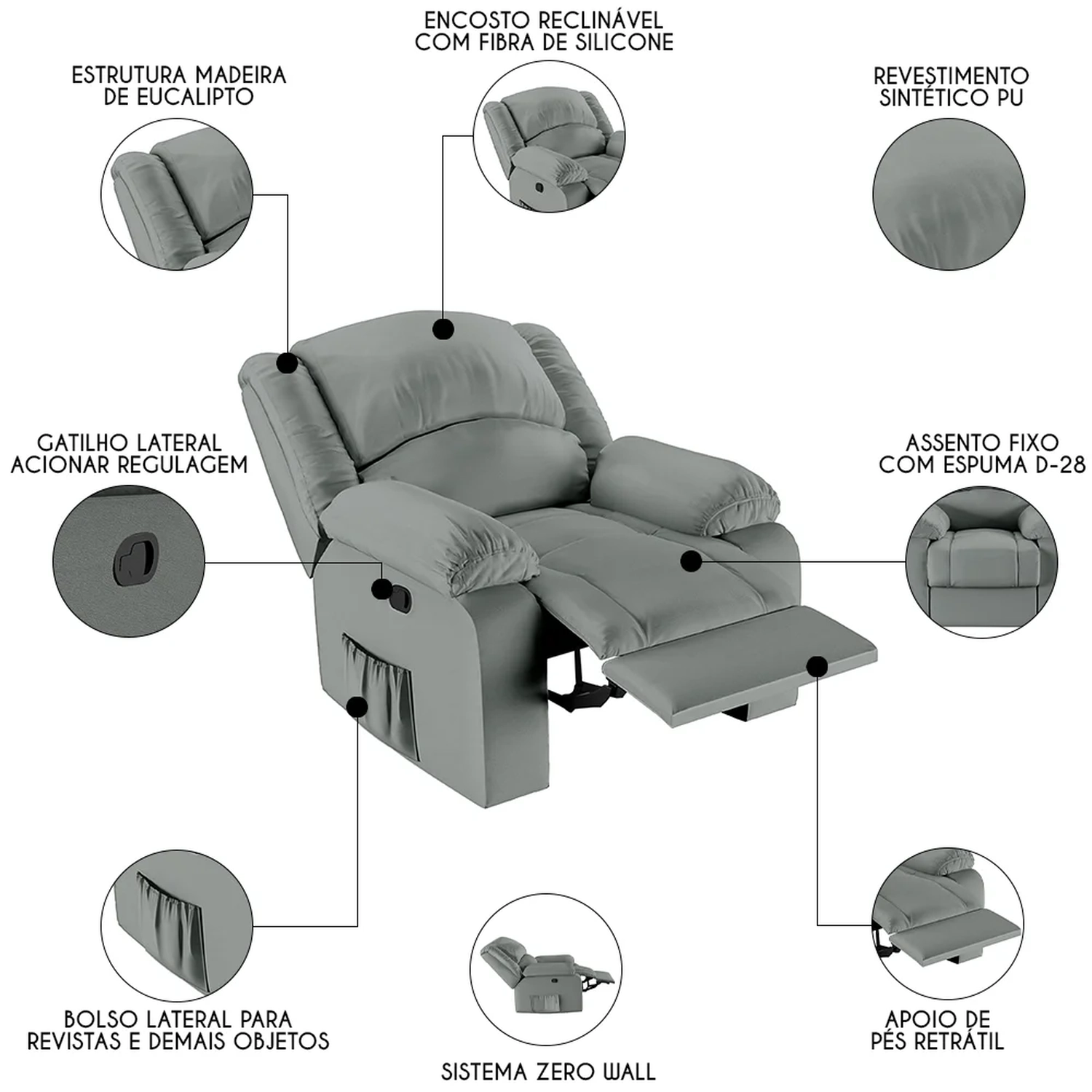 Hora de transformar sua Sala De Estar em um espaço de entretenimento comparável a uma sala de cinema privada? A Poltrona do Papai Reclinável Pietra Zero Wall FH9 PU Cinza, da Mpozenato é a adição perfeita para alcançar esse sonho.