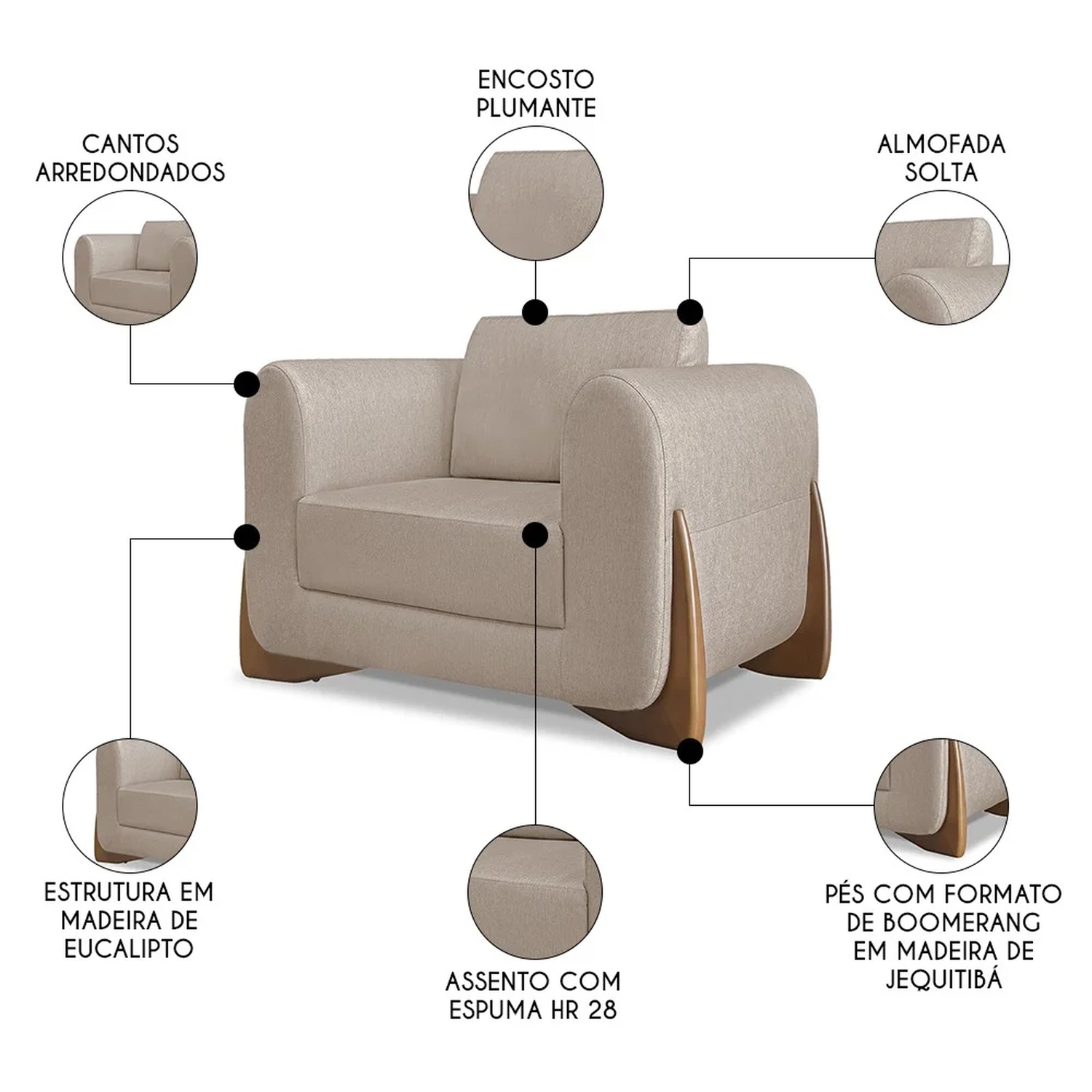 A Poltrona para Sala é revestida em linho de alta qualidade, proporcionando uma textura agradável ao toque. Os pés da poltrona são um destaque à parte, com acabamento em madeira de jequitibá, conhecida por sua durabilidade e beleza natural. A estrutura é feita de madeira maciça de eucalipto, garantindo resistência e durabilidade. O assento é equipado com espuma de alta resiliência HR28, complementada por plumante em silicone, oferecendo um equilíbrio perfeito entre suporte e maciez. O design dos pés em formato boomerang, com 8 cm de altura na cor mel, adiciona um toque retro-moderno à peça. Esta Poltrona Decorativa não é apenas um móvel, mas uma peça de decoração que reflete sofisticação e um padrão de acabamento de alto nível para a sua Sala de Estar.