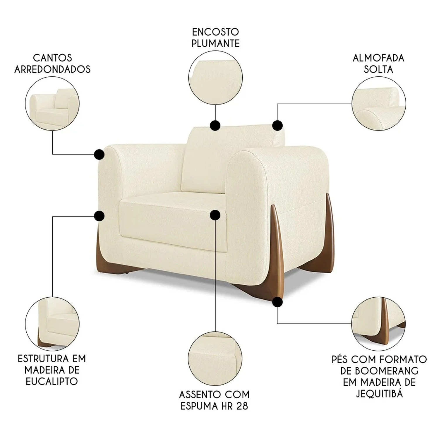 A Poltrona para Sala é revestida em linho de alta qualidade, proporcionando uma textura agradável ao toque. Os pés da poltrona são um destaque à parte, com acabamento em madeira de jequitibá, conhecida por sua durabilidade e beleza natural. A estrutura é feita de madeira maciça de eucalipto, garantindo resistência e durabilidade. O assento é equipado com espuma de alta resiliência HR28, complementada por plumante em silicone, oferecendo um equilíbrio perfeito entre suporte e maciez. O design dos pés em formato boomerang, com 8 cm de altura na cor mel, adiciona um toque retro-moderno à peça. Esta Poltrona Decorativa não é apenas um móvel, mas uma peça de decoração que reflete sofisticação e um padrão de acabamento de alto nível para a sua Sala de Estar.