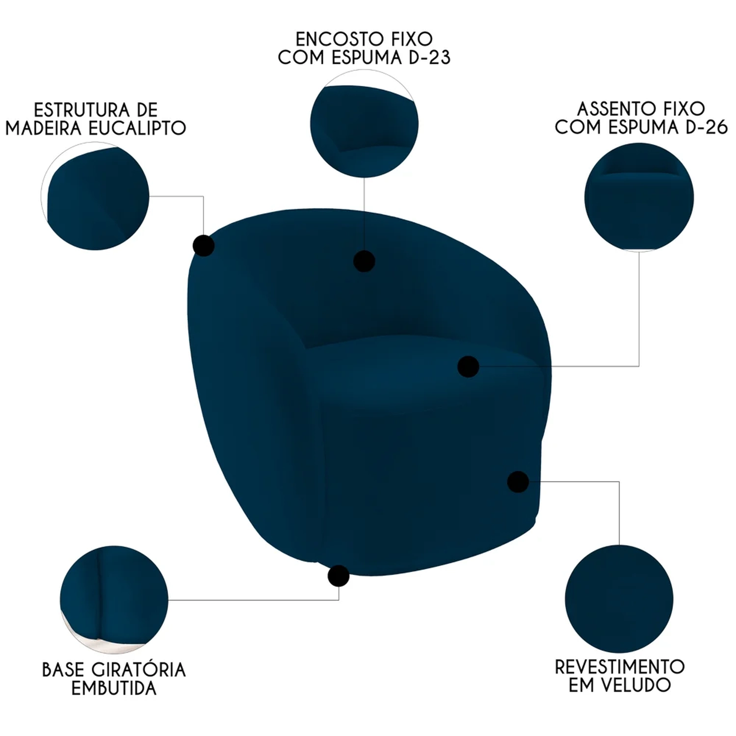 A Poltrona para Sala de Estar Giratória Orgânica Garbin Z08 Veludo Azul Marinho, da Mpozenato é uma verdadeira obra de arte no mundo do design de interiores, conheça!