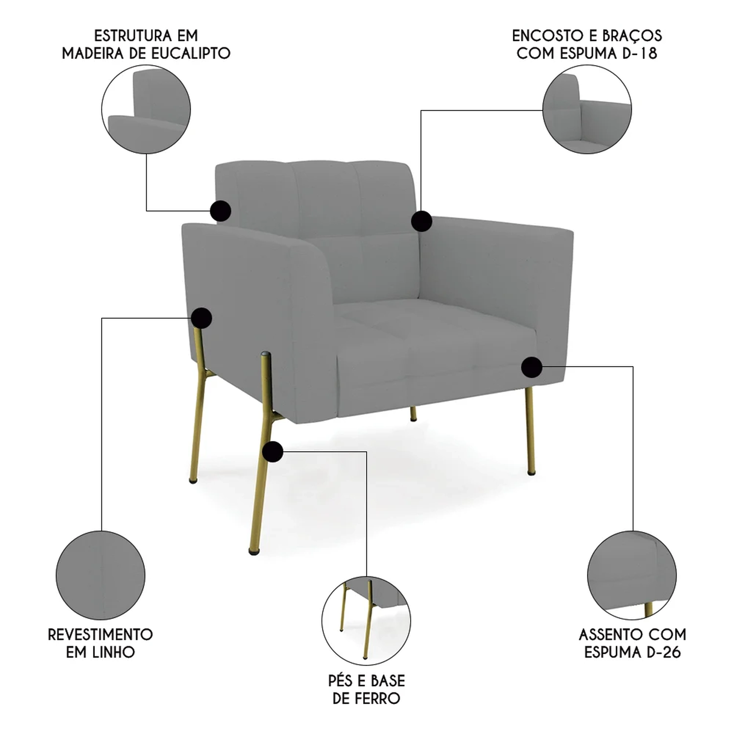 Você está procurando um Kit Poltrona que combine com a sua Sala De Estar, recepção ou seu quarto, que ofereça conforto e qualidade? Então você vai adorar a Poltrona Para Sala Pé Metal Dourado Kit 2 Ana Linho Grafite White, da Ibiza!