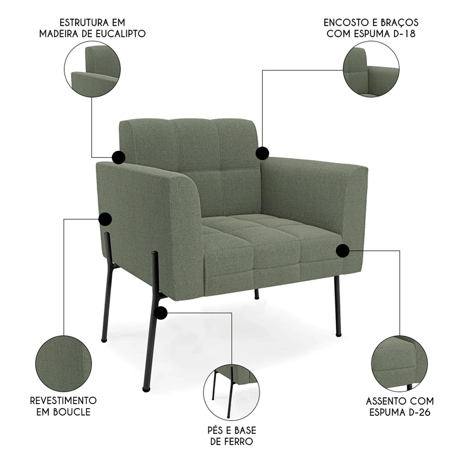 Você está procurando um Kit Poltrona que combine com a sua Sala De Estar, recepção ou seu quarto, que ofereça conforto e qualidade? Então você vai adorar a Poltrona Para Sala Pé Metal Preto Kit 2 Ana Boucle Menta, da Ibiza!