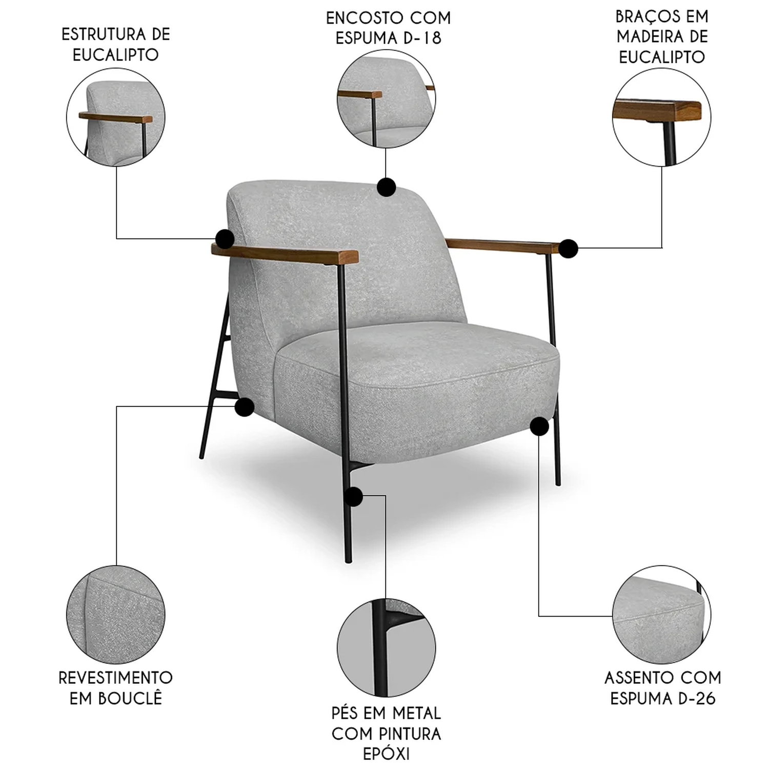 A Poltrona para Sala Pés Metálicos Ellen S06 Boucle Cinza, da Mpozenato é uma peça que exemplifica a alta decoração com seu design único, capaz de se adaptar a uma variedade de ambientes, desde os mais clássicos até os de Estilo Industrial.