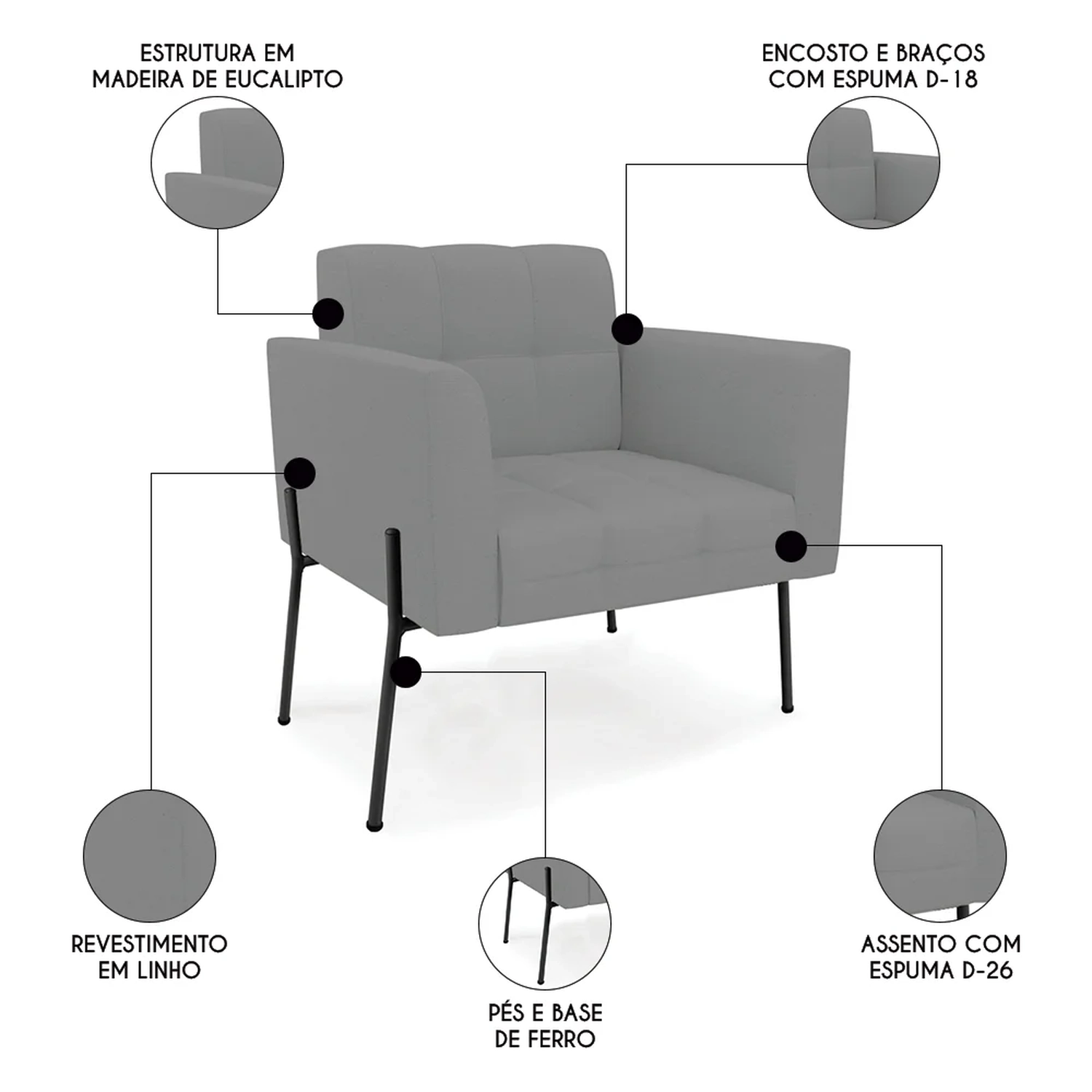 Você está procurando uma poltrona que combine com a sua Sala De Estar, recepção ou seu quarto, que ofereça conforto e qualidade? Então você vai adorar a Poltrona Para Sala Pés Metálicos Preto Ana Linho Grafite, da Ibiza!